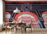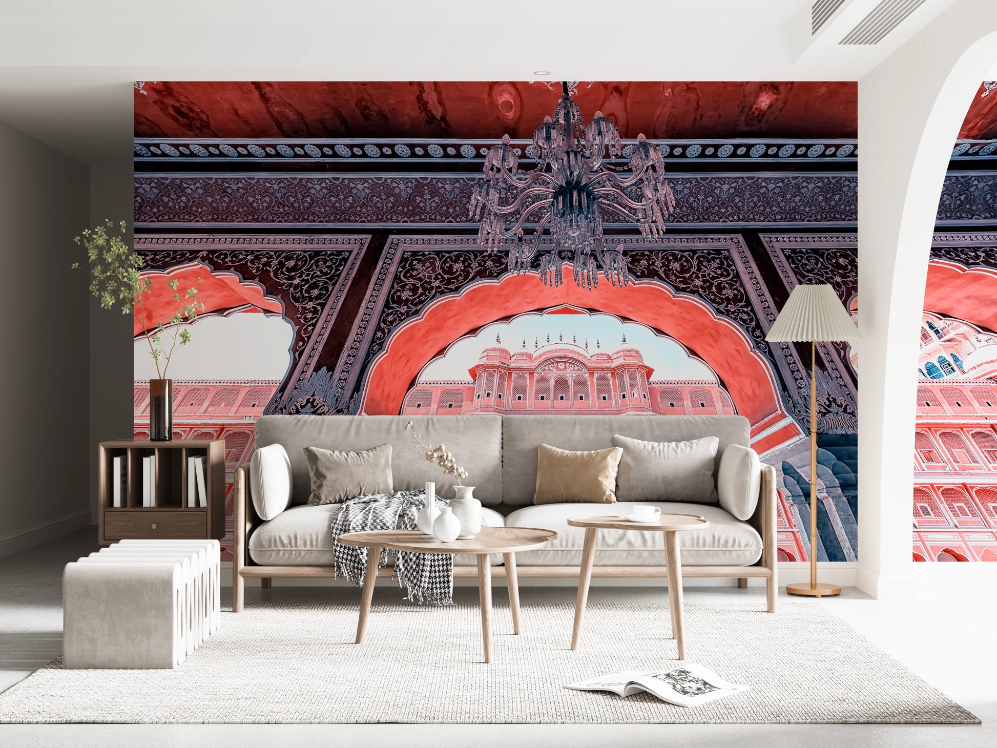 Transform your living space with this majestic Jaipur Palace view wallpaper for walls. Showcasing elaborate architecture with intricate patterns in coral and off-white, this design brings a touch of Indian grandeur to any room. The ornamental details and chandelier offer a luxurious feel, perfect for living rooms, dining rooms, or hallways. The coral hues create a warm and inviting ambience, while the detailed craftsmanship adds depth and visual interest. Elevate your home décor with this statement piece that embodies both culture and elegance.