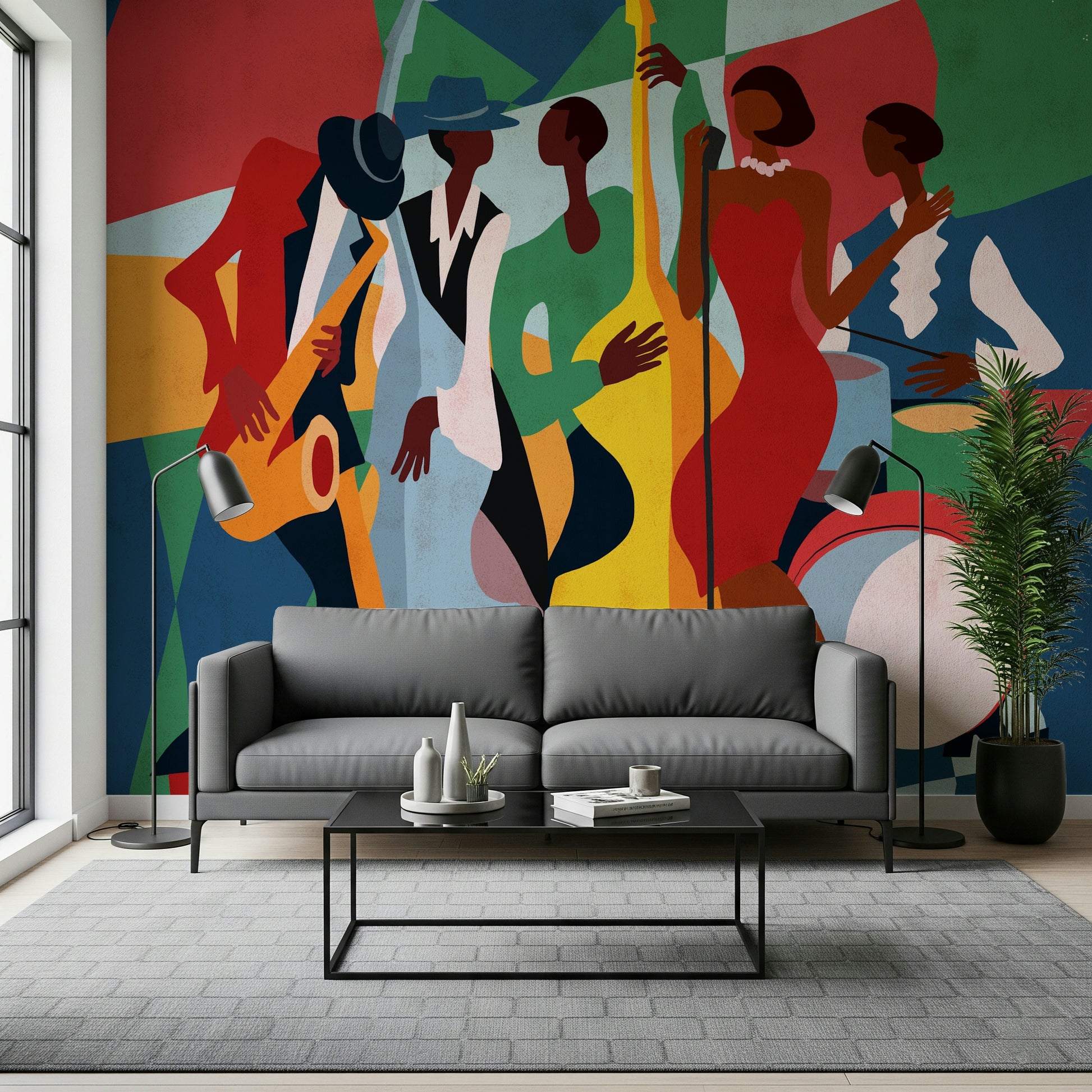 Bring the energy of live music into your home with this vibrant wallpaper for walls. The design presents a jazz band ensemble in a colourful, geometric style. Strong lines and a bold colour palette of reds, blues, greens, and yellows create a lively and sophisticated ambience. Perfect for living rooms, dining areas, or even home offices, this wallpaper injects a sense of rhythm and artistic flair into any space. The dynamic composition complements modern and art deco interiors, offering an eye-catching accent that inspires creativity and conversation.