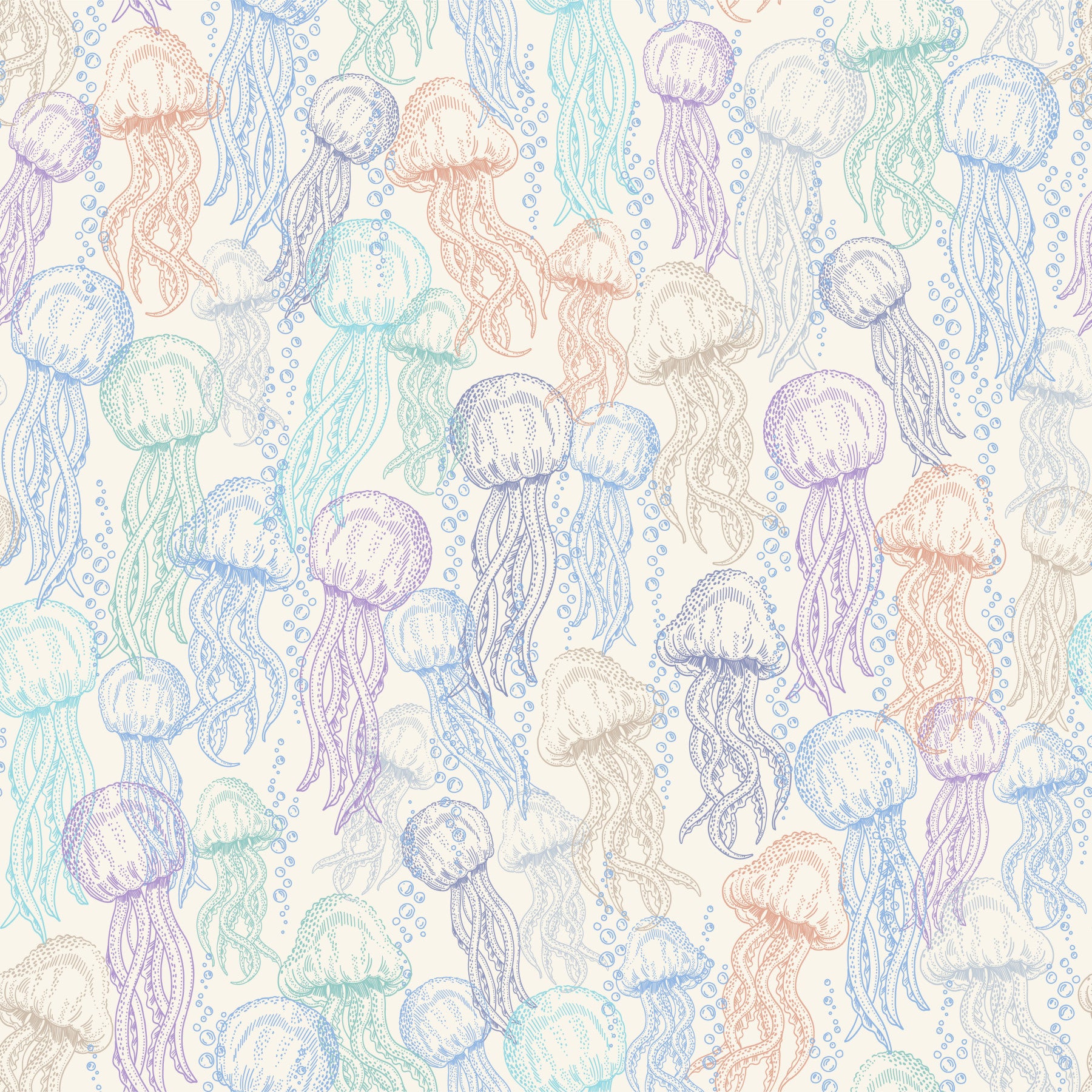 Dive into a whimsical underwater world with this 'Jellyfish Doodles' wallpaper. A captivating pattern of delicately sketched jellyfish floats across a soft, creamy background. Rendered in a charming pastel palette of blues, purples, and oranges, each jellyfish is uniquely detailed, showcasing its graceful tentacles and bell-like body. The addition of playful bubbles adds a sense of movement and lightheartedness, making this a perfect choice for those seeking a serene yet playful aesthetic. The intricate doodle style brings a hand-drawn charm, evoking a feeling of calm and quiet beauty. Transform your digital space into an enchanting ocean dreamscape.