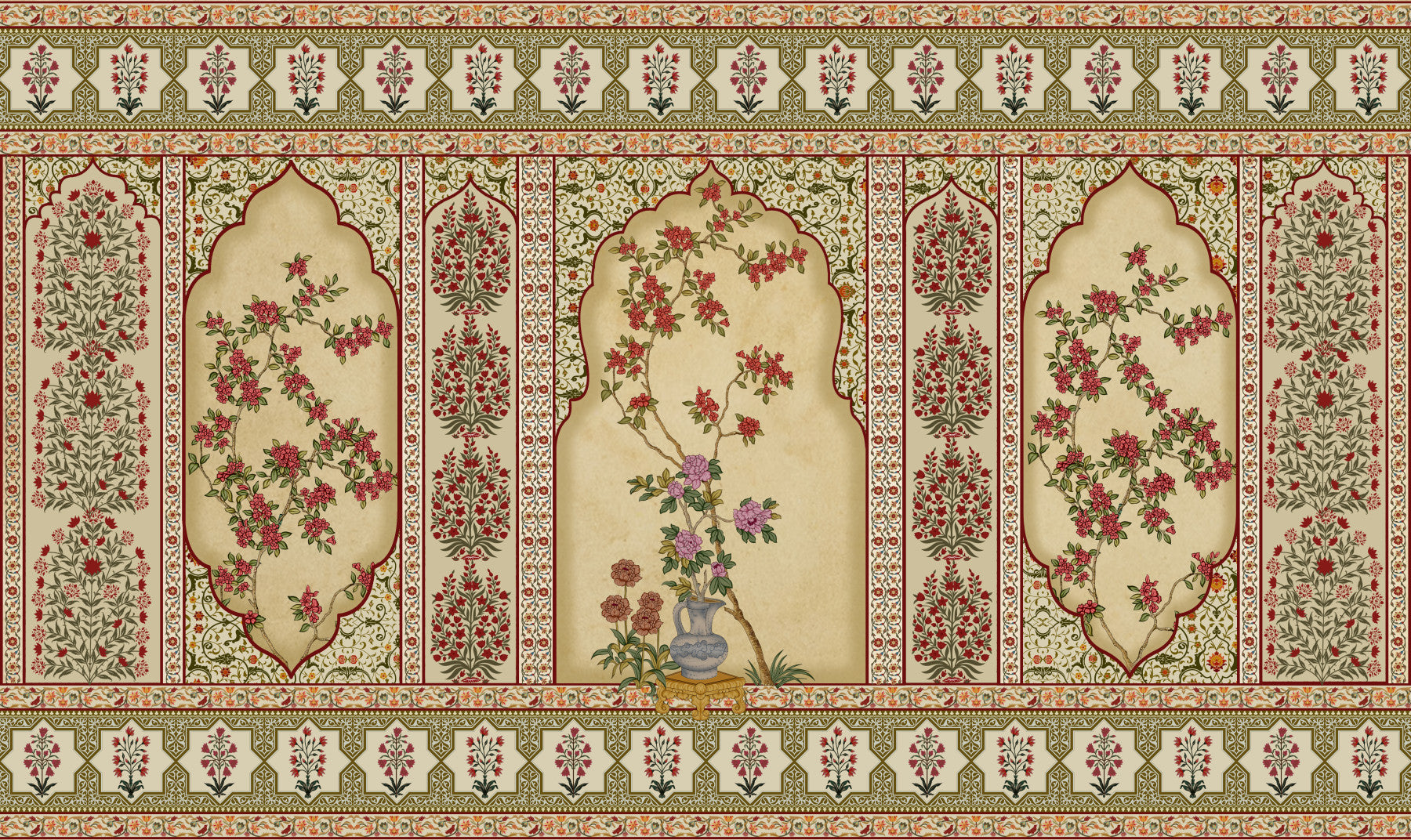Step into the serene beauty of a Mughal garden with Jharokha-e-Bagh a wallpaper that captures the essence of classical Indian artistry. Inspired by the intricate designs of traditional Jharokha windows, this piece offers a picturesque view into a lush, flowering garden. Delicate floral motifs in rich reds and greens cascade within arched panels, framed by ornate borders featuring meticulous geometric patterns and stylized botanical elements. A central panel showcases a beautifully rendered vase filled with blossoms, lending a touch of realism and tranquility to the scene. This design evokes a sense of heritage and elegance, perfect for creating a sophisticated and inviting ambiance in any room. The warm, earthy tones and detailed craftsmanship of "Jharokha-e-Bagh" will transform your space into a peaceful sanctuary, reminiscent of the timeless beauty found within the walls of an ancient palace. Let this exquisite wallpaper bring a touch of Mughal grandeur to your home.