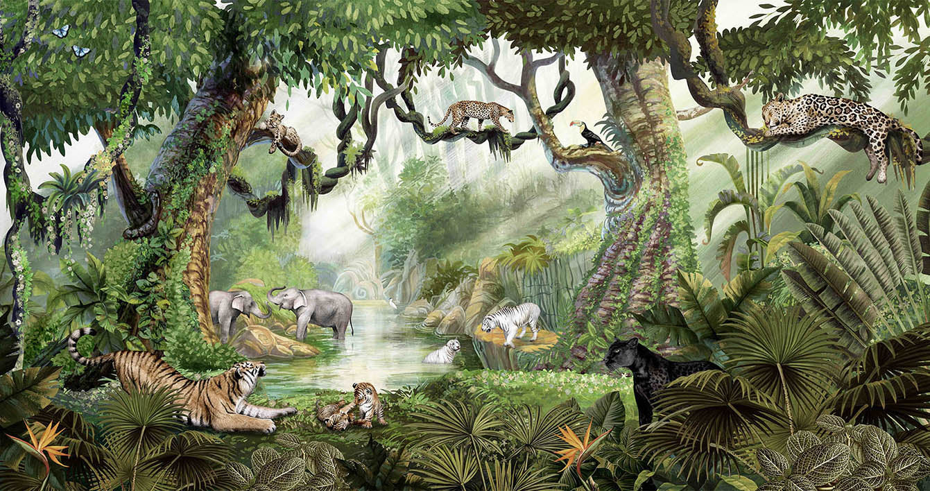 Turn your space into an exotic rainforest with animal jungle wallpaper that revives every single corner with green luxury. It’s vibrant with a lush forest and features a cat family with a bunch of other animals, perfect for little adventurers and explorers. This also reminds of tropical landscapes filled with dense trees, wild animals, narrow streams and palms, covering the space with greenery and lush vegetation. It's powerful, with nature’s addition that rejuvenates every corner with the outdoors’ beauty and breathtaking view. This jungle safari big cats murals would be your kid’s favourite and ignite a passion for a greener Earth.