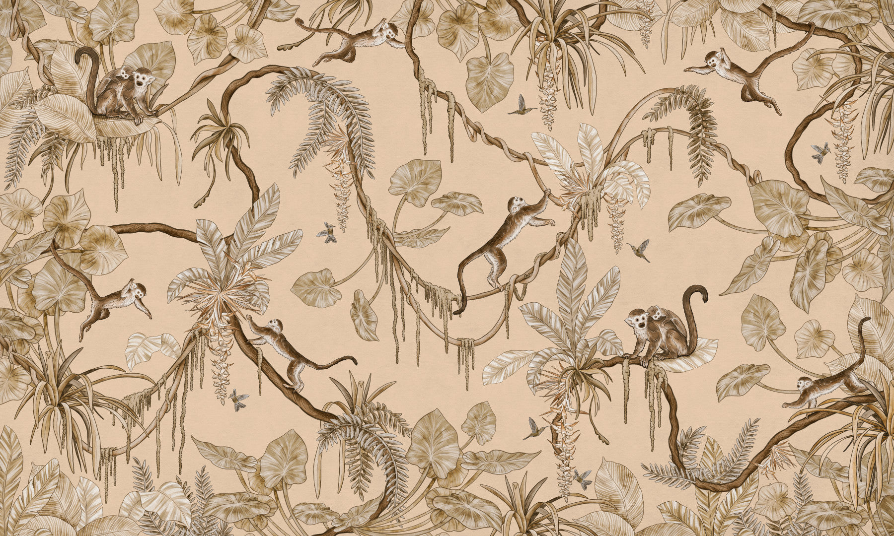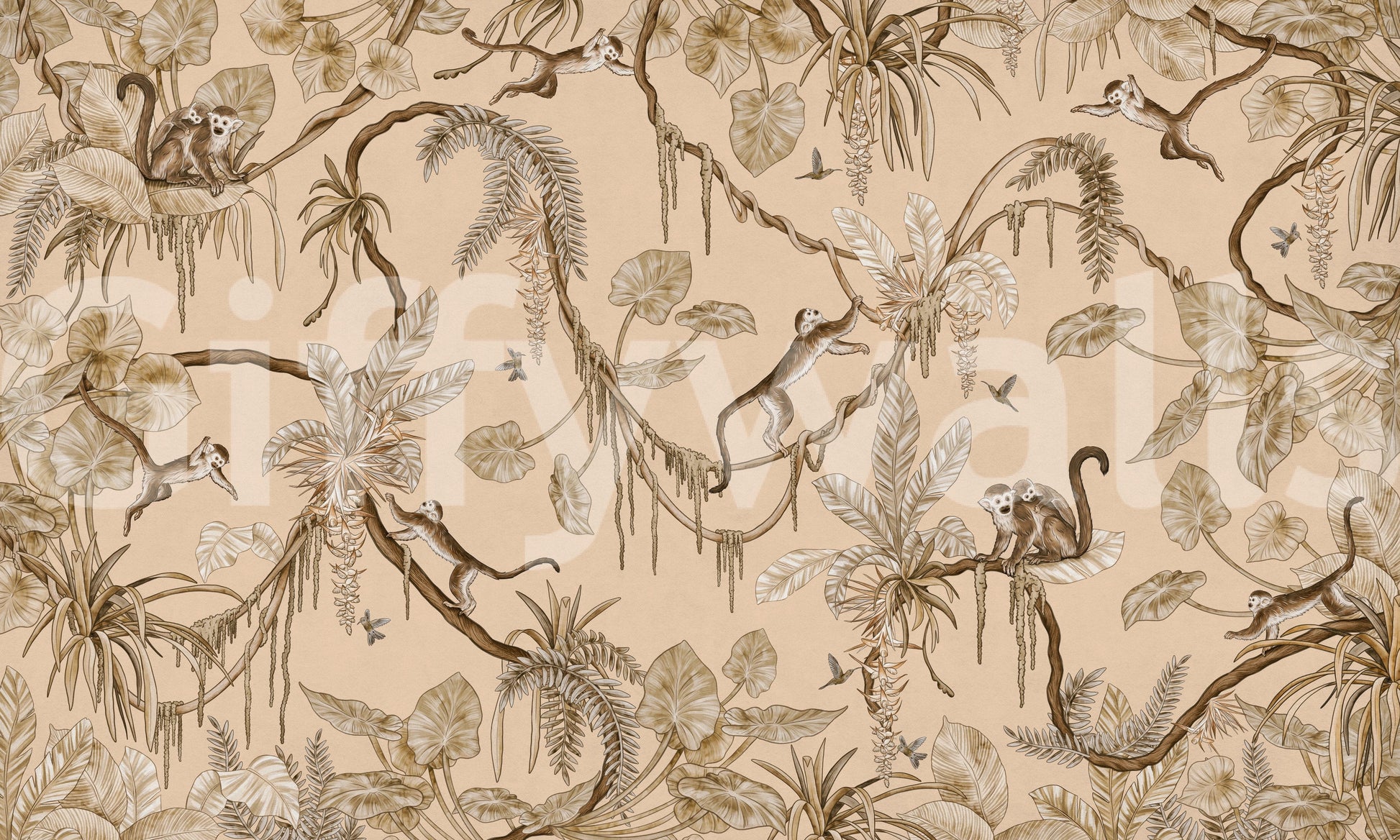 Bring the adventure to your walls with this detailed jungle scene. Playful monkeys swing amongst lush tropical foliage in shades of beige and brown. The pattern provides a classic and comforting feel. This wallpaper for walls is great for a nursery, bedroom, or living room. It introduces a touch of nature and curiosity to any space. The design features birds and monkeys that complement bohemian and classic interiors.