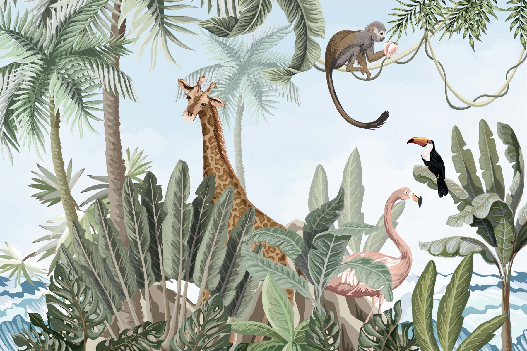 Create an enchanting retreat with this unique wallpaper featuring a playful jungle scene. Discover a giraffe peering through lush foliage, a graceful flamingo, a curious monkey, and a toucan amongst tropical greenery. The soft pastel color palette brings a sense of calm and serenity. This wallpaper for walls transforms kids rooms and nurseries, adding a touch of whimsy and sophistication. The unique design elevates any space with artistic flair.