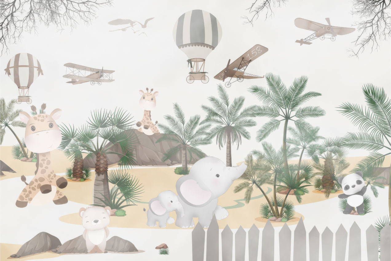 Embark on a whimsical journey with the jungle jamboree wall mural, a fantastical nursery wallpaper that promises to whisk little imaginations away to a land of playful pandas, gentle giraffes, and charming elephants. Each brush stroke captures the spirit of adventure, turning the nursery into a vibrant playground for dreams. Watch as the walls come alive with the soft rustle of palm fronds and the silent flap of vintage planes, inviting tales of wonder and excitement. This nursery wallpaper is more than just a backdrop it's a storybook unfurling across the room, inviting tiny tots to giggle and explore the friendly fauna. Create a haven for creativity where every glance sparks a new narrative, a place where young minds flourish among the treetops and stars.