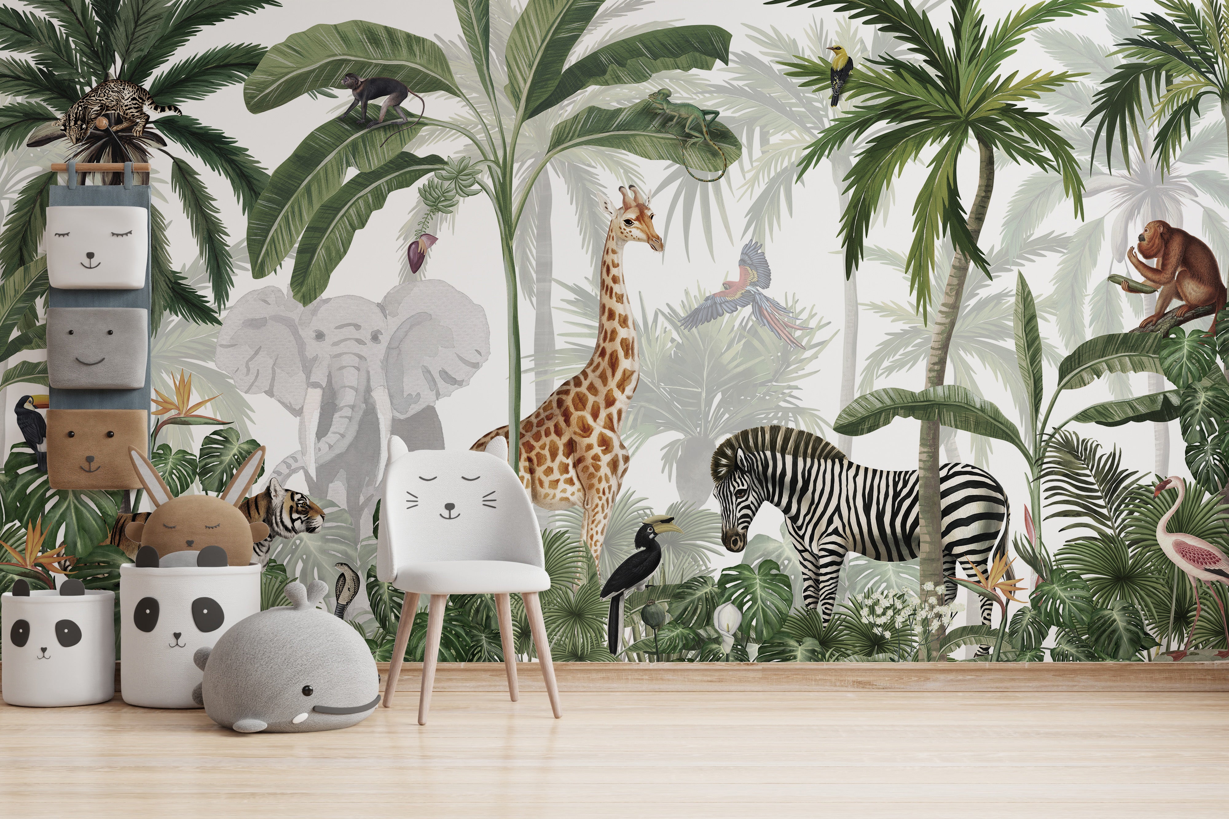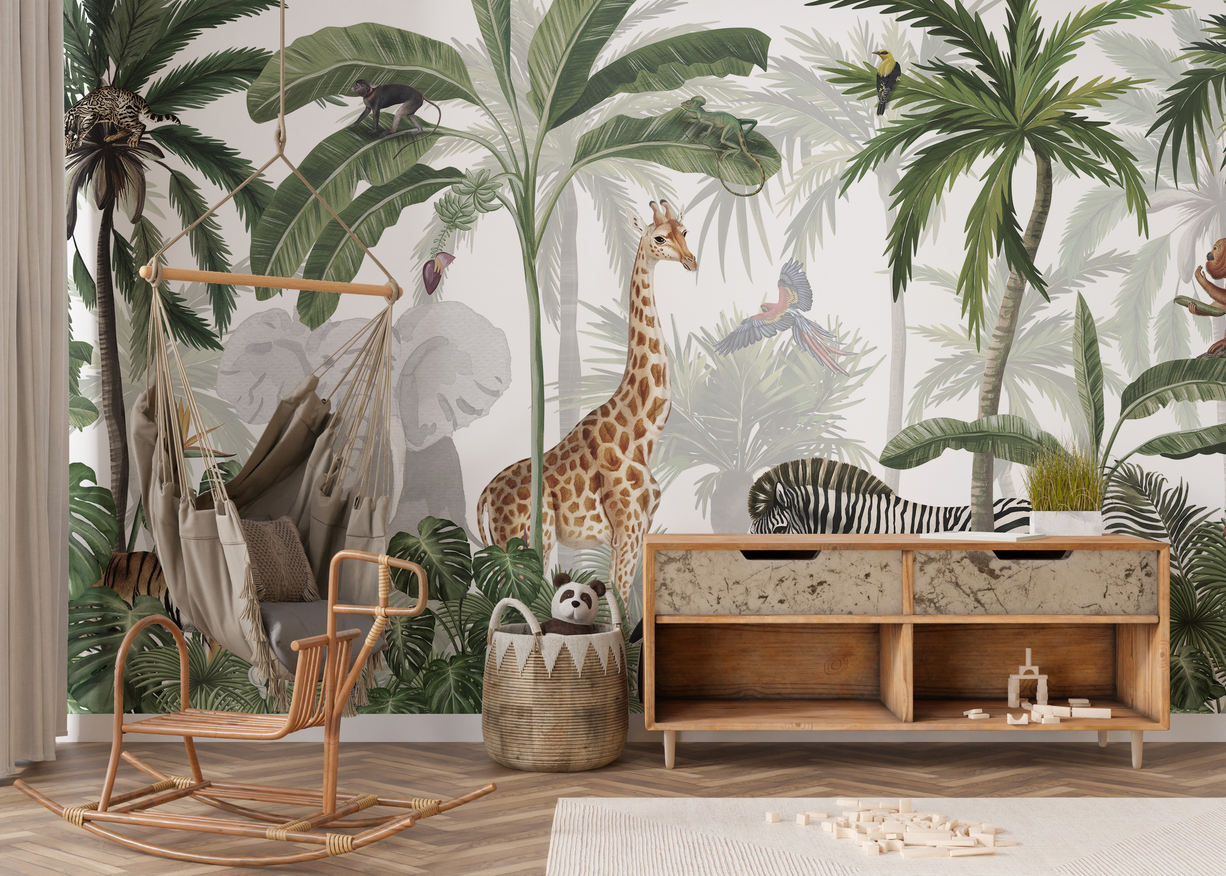 Tropical jungle mural featuring wildlife-themed wallpaper