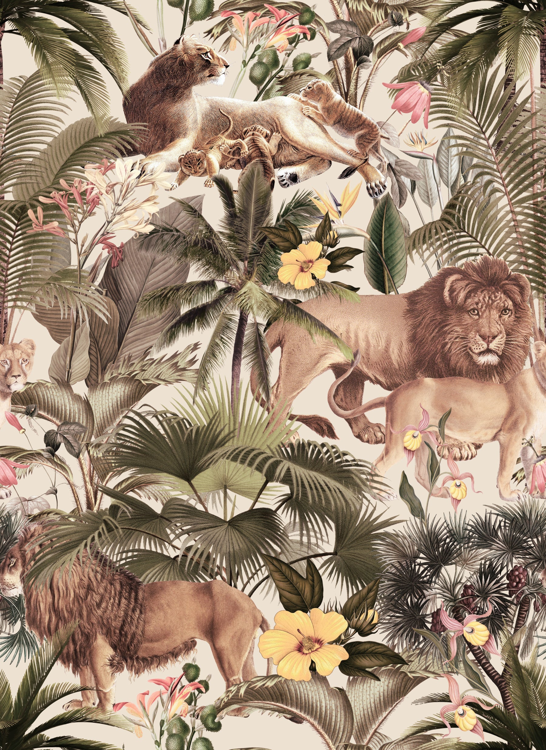 Experience the untamed beauty of 'Jungle Majesty,' a captivating wallpaper that captures the raw elegance of lions amidst a lush jungle backdrop. The detailed rendering of the lions, their powerful presence subtly woven into the rich tapestry of tropical flora, creates a striking visual narrative. Muted greens, browns, and warm beige tones give the design a sophisticated vintage aesthetic. Perfect for those seeking a unique and luxurious statement piece for their home, this wallpaper effortlessly transforms any space into a tranquil haven, a testament to the powerful yet harmonious coexistence of nature and its inhabitants. This design is ideal for living rooms, bedrooms, or entryways.