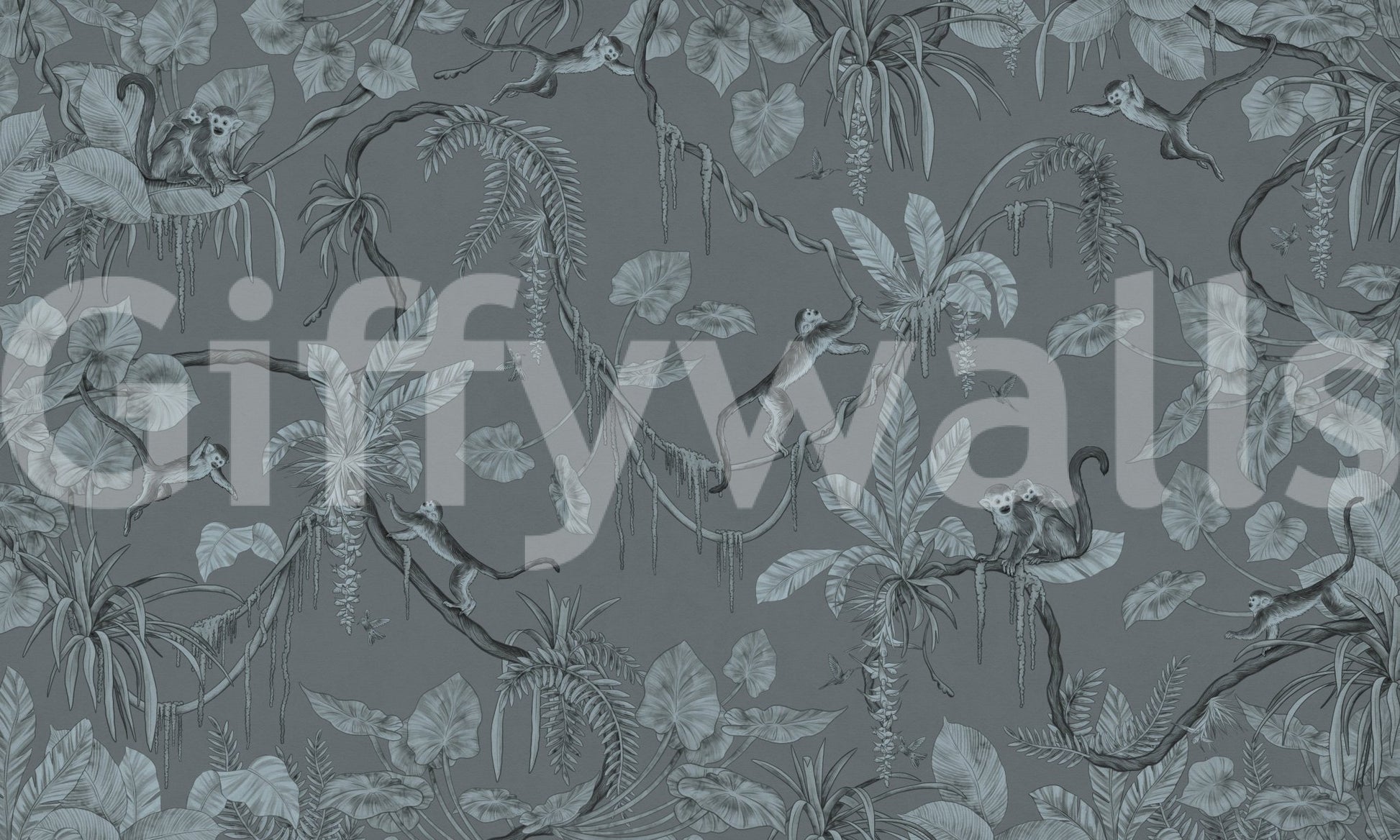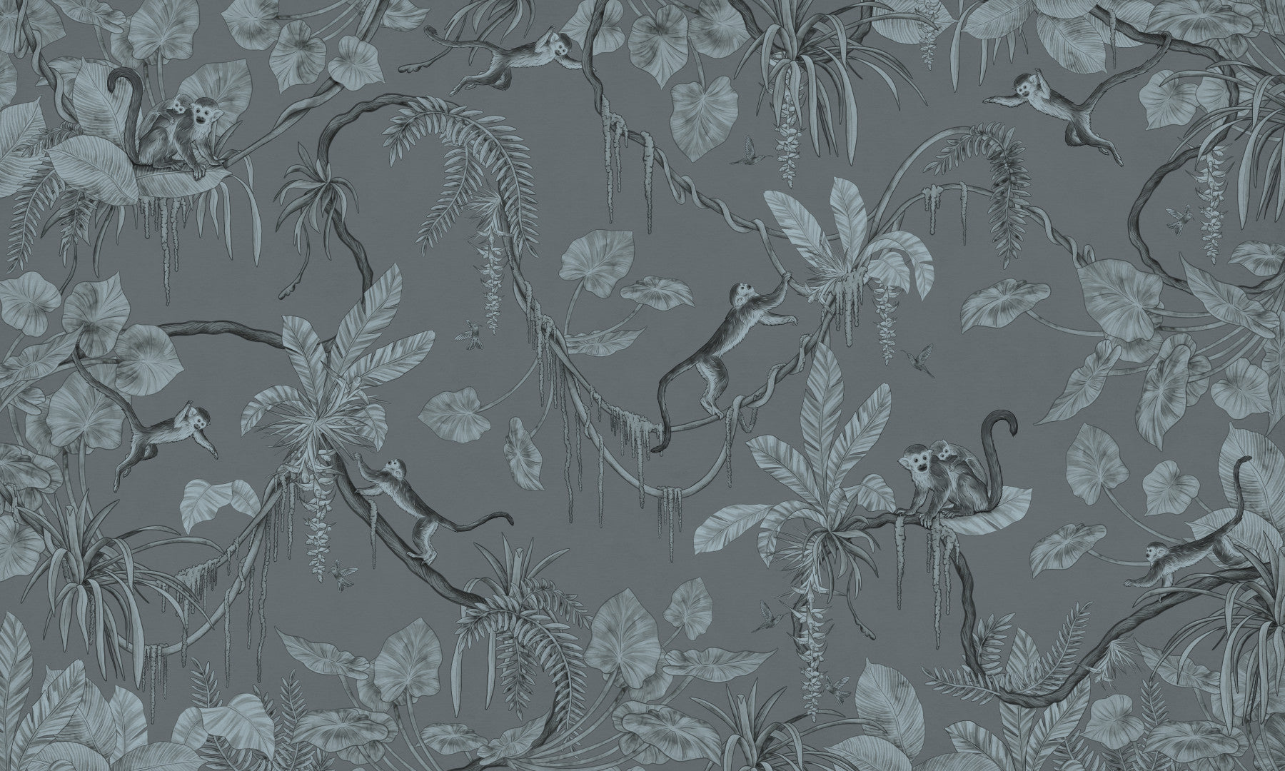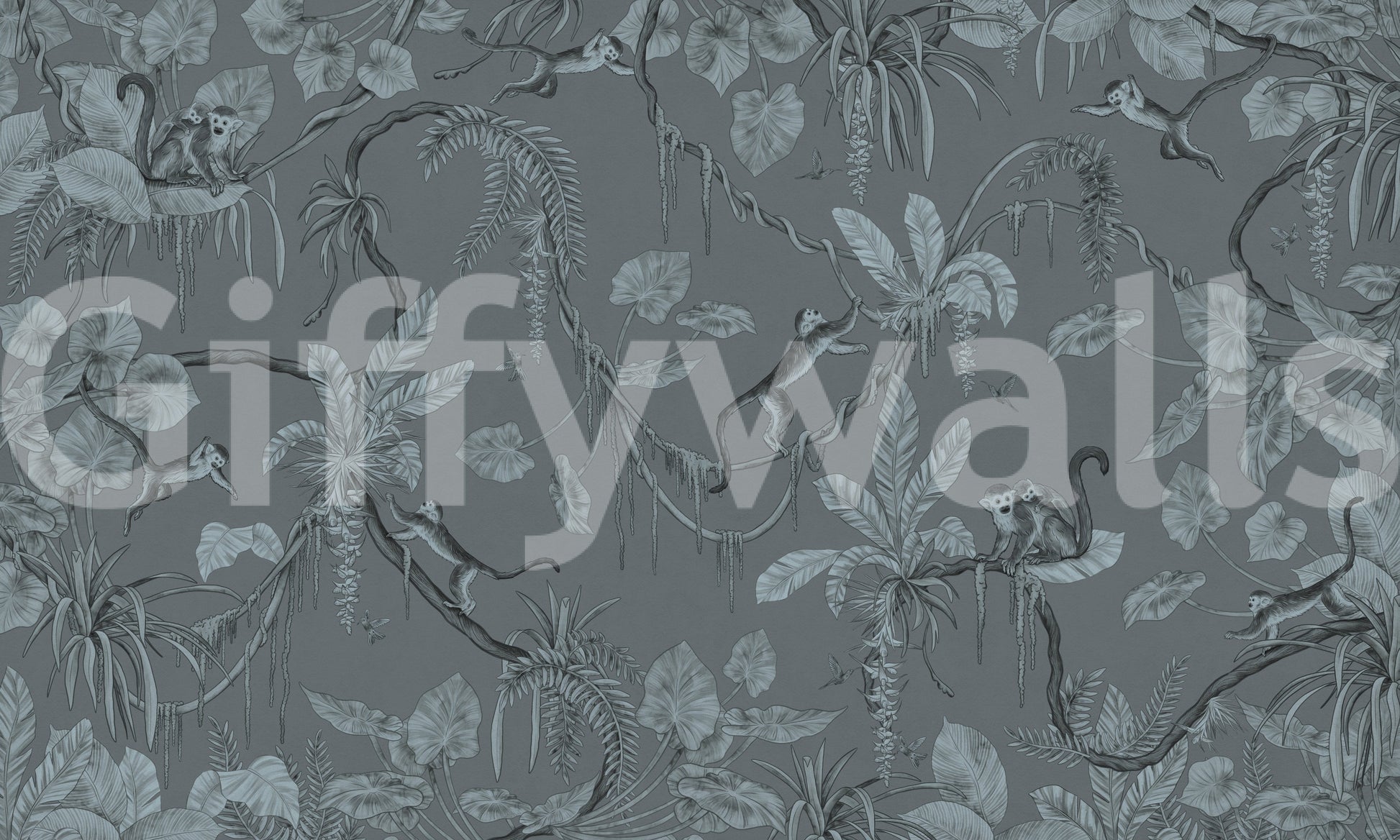Introduce a touch of the wild into your home with this elegant jungle-themed wallpaper for walls. This design showcases monkeys in a lush setting, brought to life with delicate sketches in varying shades of blue. Perfect for a study or nursery, this wallpaper stimulates imagination and encourages a tranquil mood. The design elegantly complements interiors, blending artistry with natural beauty. Let this stunning wallpaper be the backdrop for inspired living.