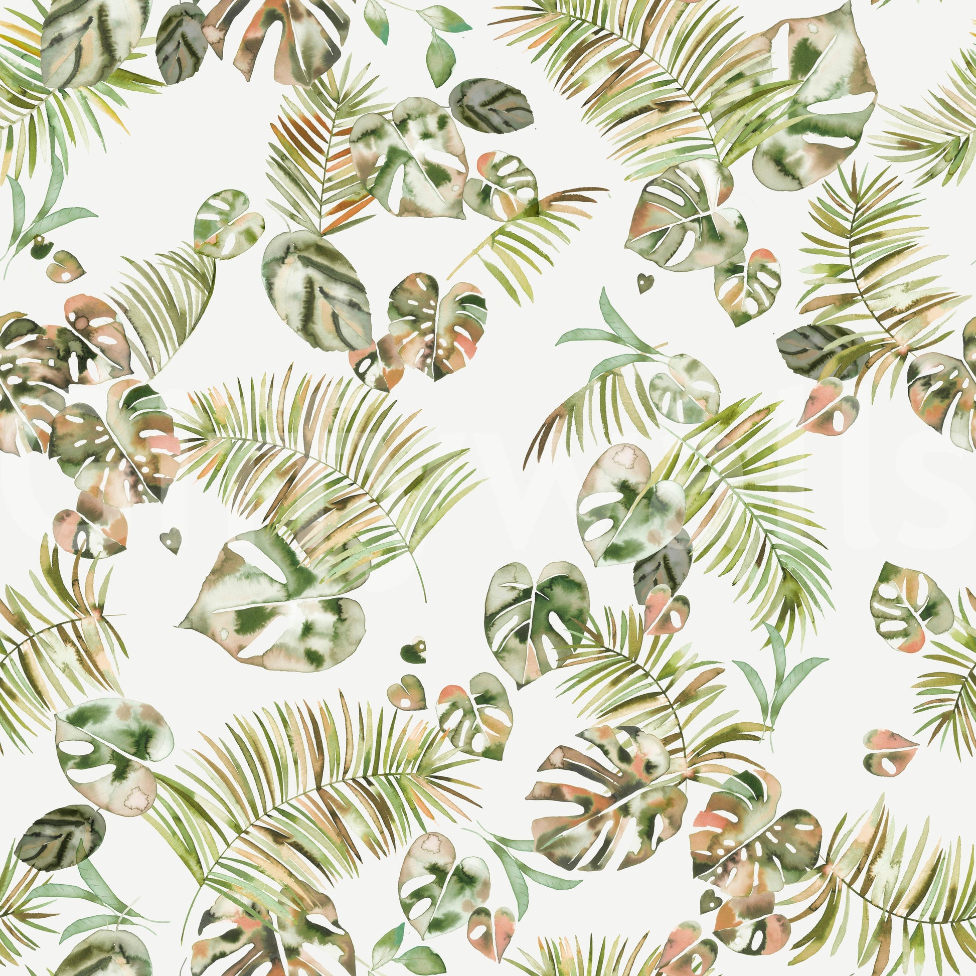 Immerse yourself in the lush beauty of this 'Jungle Tropical Leaves' wallpaper. A captivating watercolor design features a vibrant array of tropical foliage, showcasing the intricate details of monstera leaves and delicate palm fronds. Earthy greens, soft browns, and subtle peach tones create a calming yet invigorating atmosphere, perfect for bringing a touch of exotic paradise to your digital space. The seamless pattern ensures a visually pleasing and consistent aesthetic, transporting you to a tranquil jungle retreat with every glance.