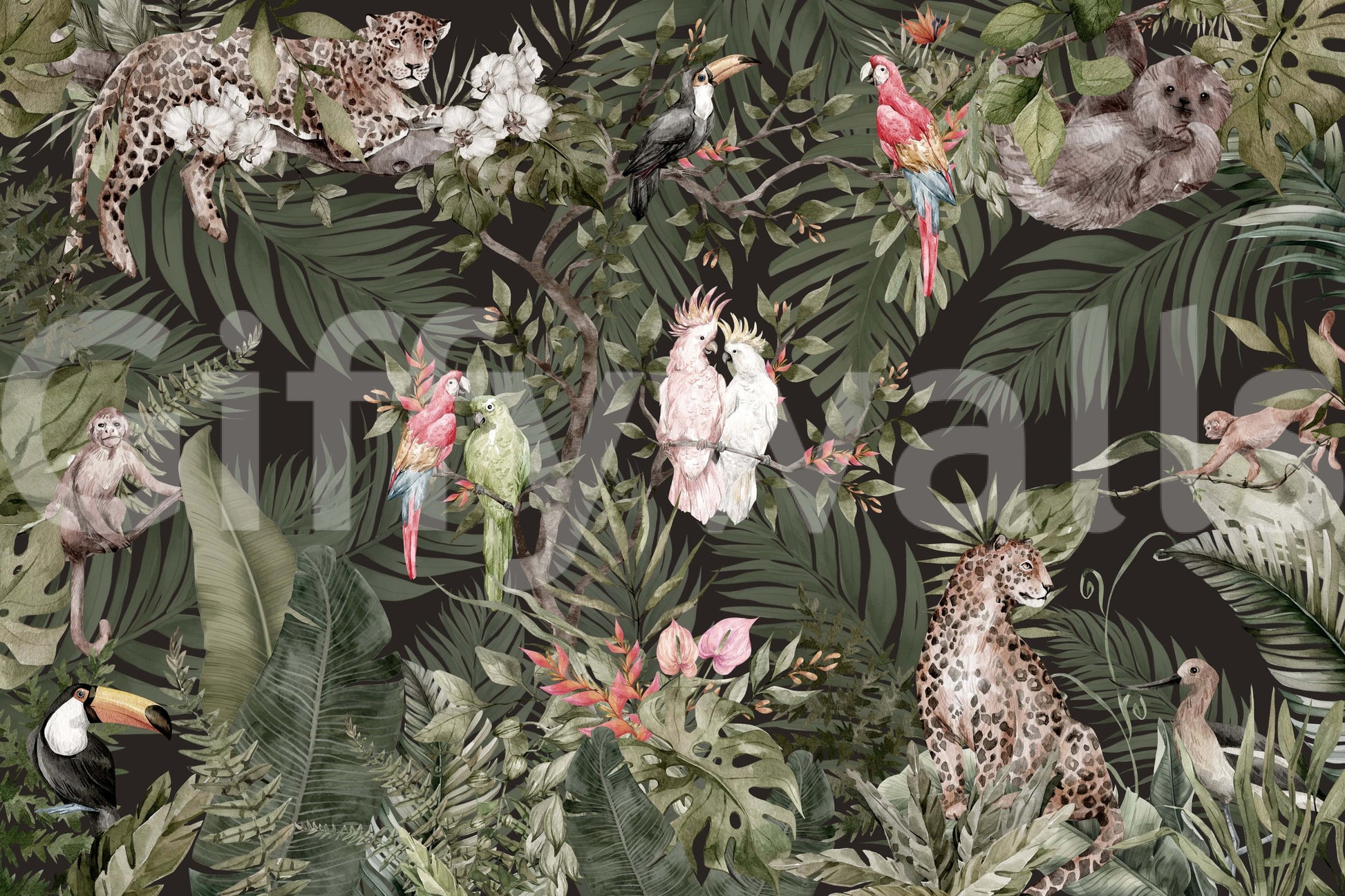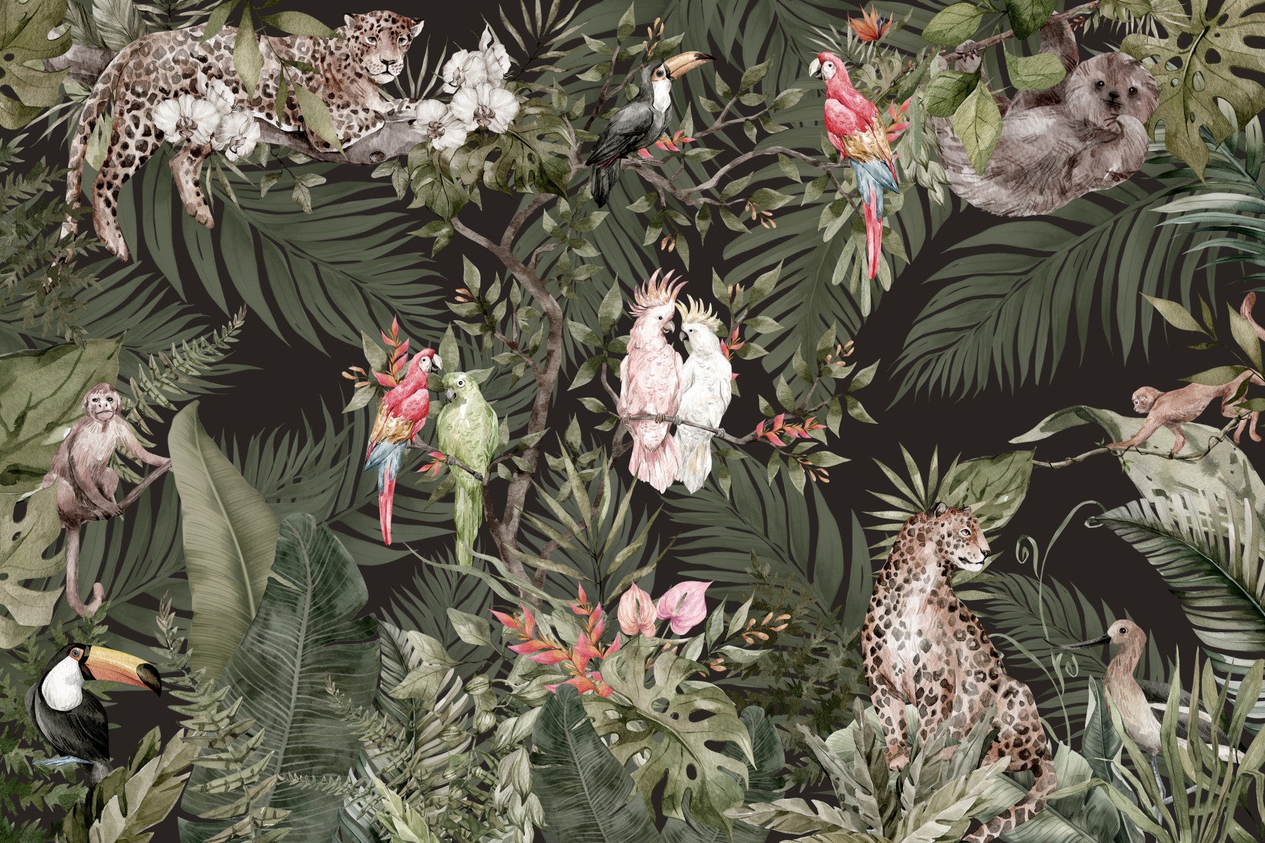 Embrace the tranquility of the jungle with this captivating wallpaper. Discover playful monkeys, graceful leopards, and colorful birds hidden among dense, lush foliage. This design works wonders as wallpaper for walls, inviting a sense of adventure and calm. The rich, deep green background makes the bright colors pop, suitable for a living room, dining room, or bedroom. The artistic rendering of leaves creates a dramatic effect, perfect for completing interiors with a tropical touch.