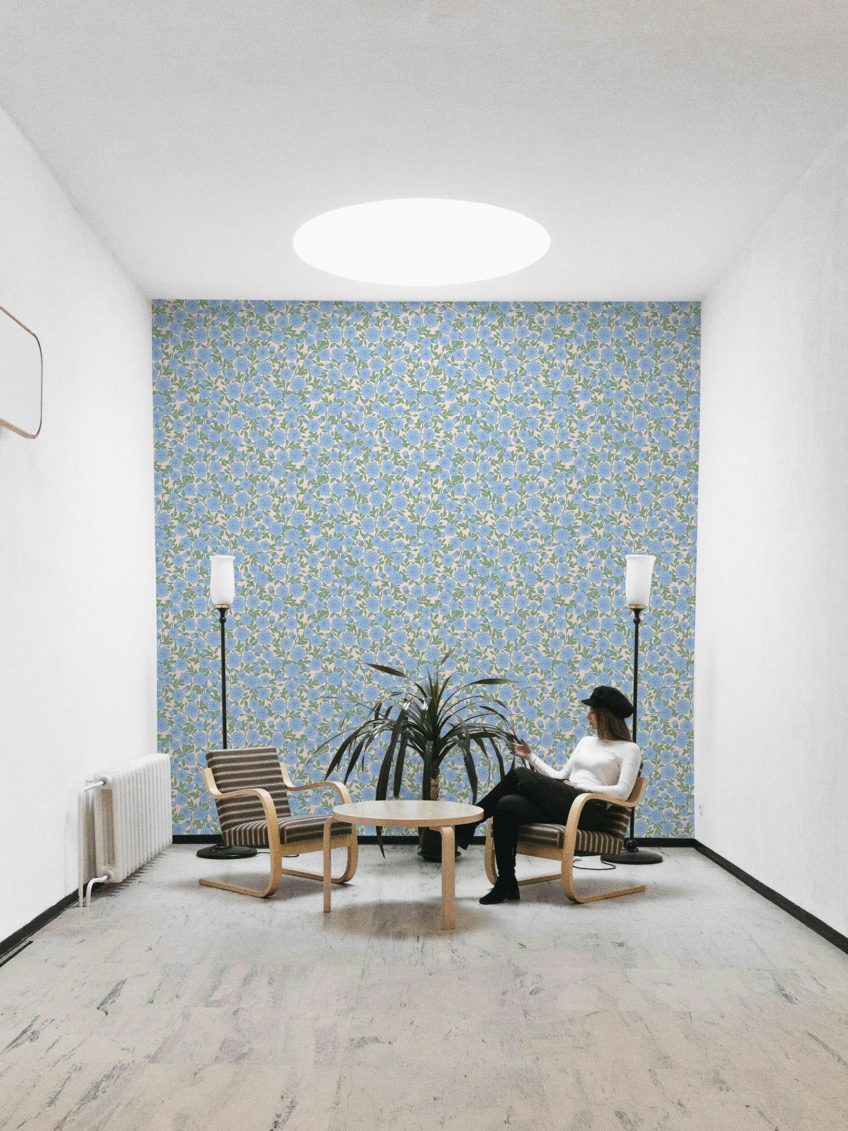 Juno Welcoming Walls blue floral wallpaper for peaceful rooms