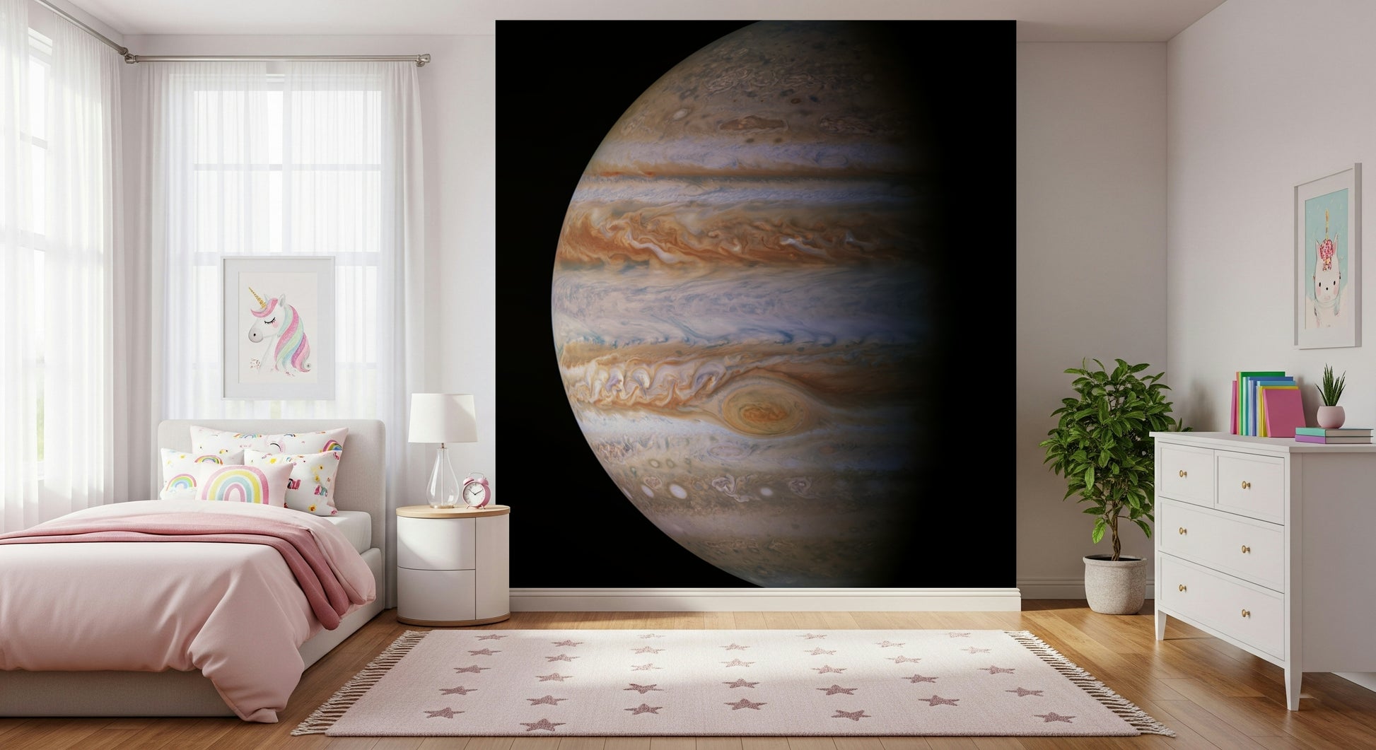 Bring the wonder of space into your home with this wallpaper for walls, featuring the planet Jupiter. Notice the swirling bands of colour, from deep blues to warm browns. This design sparks curiosity and imagination. It will become a great choice for a study, teen bedroom, or modern living room. Watch how the expansive image opens up the space and makes any room seem larger. Transform your walls into a cosmic display.