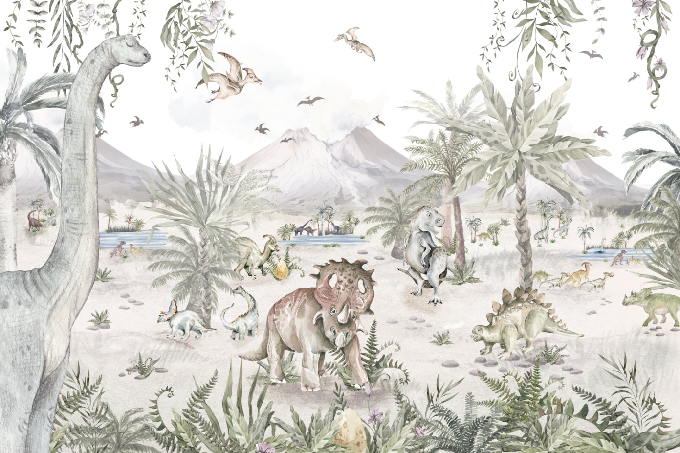 The jurassic dinosaur landscape wallpaper brings a prehistoric world to life with detailed watercolor dinosaurs roaming a lush jungle. Towering Brachiosaurus, fierce Tyrannosaurus, and gentle Triceratops wander through a land of volcanic mountains and tropical plants. Flying reptiles soar above, adding excitement to this dinosaur wallpaper for kids. The muted earthy tones and intricate details create a visually engaging dinosaur landscape mural perfect for young explorers. This Jurassic-era wallpaper mural turns walls into a scene filled with adventure and history, making it ideal for a playroom or bedroom. The realistic design captures the essence of a prehistoric jungle.