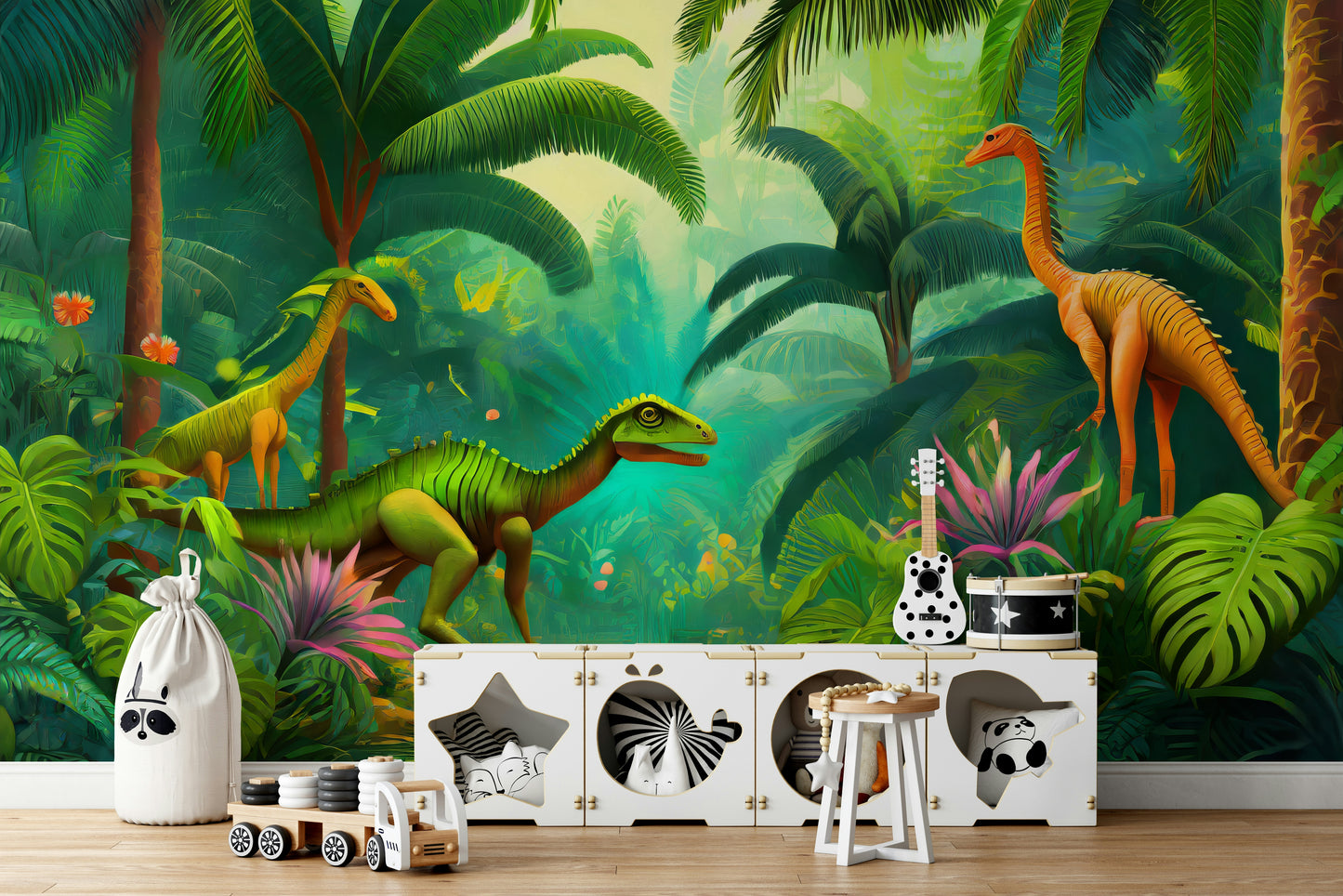 Immerse yourself in a lush, prehistoric paradise with this vibrant wallpaper. Towering palm trees and exotic foliage create a dense jungle canopy, framing a tranquil stream where dinosaurs roam. The vivid greens, oranges, and pinks evoke a sense of wonder and adventure, perfect for igniting the imagination. Whether it's a kids' room, a playroom, or a unique accent wall, bring the excitement of a Jurassic oasis to your home with this captivating design.