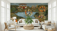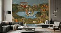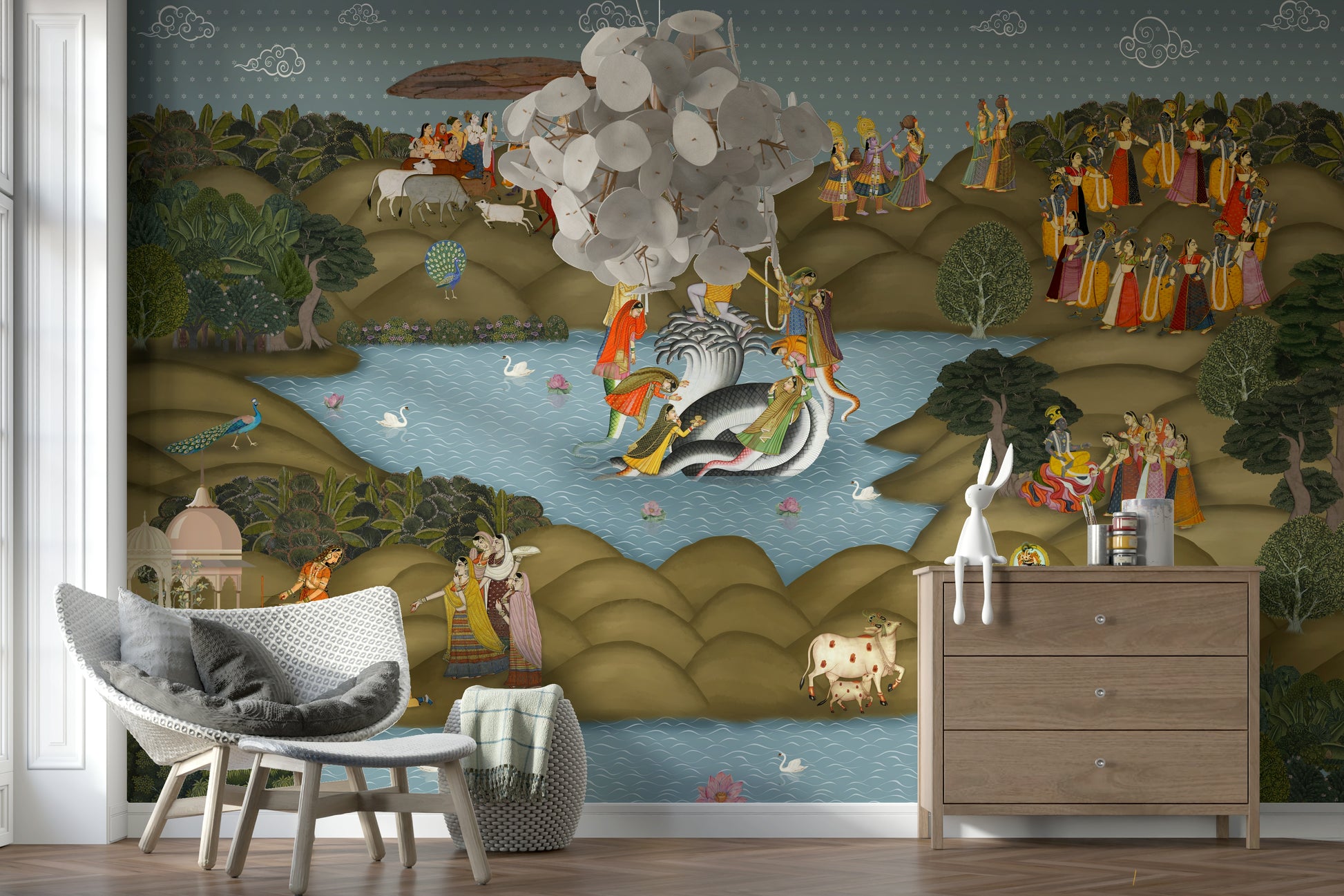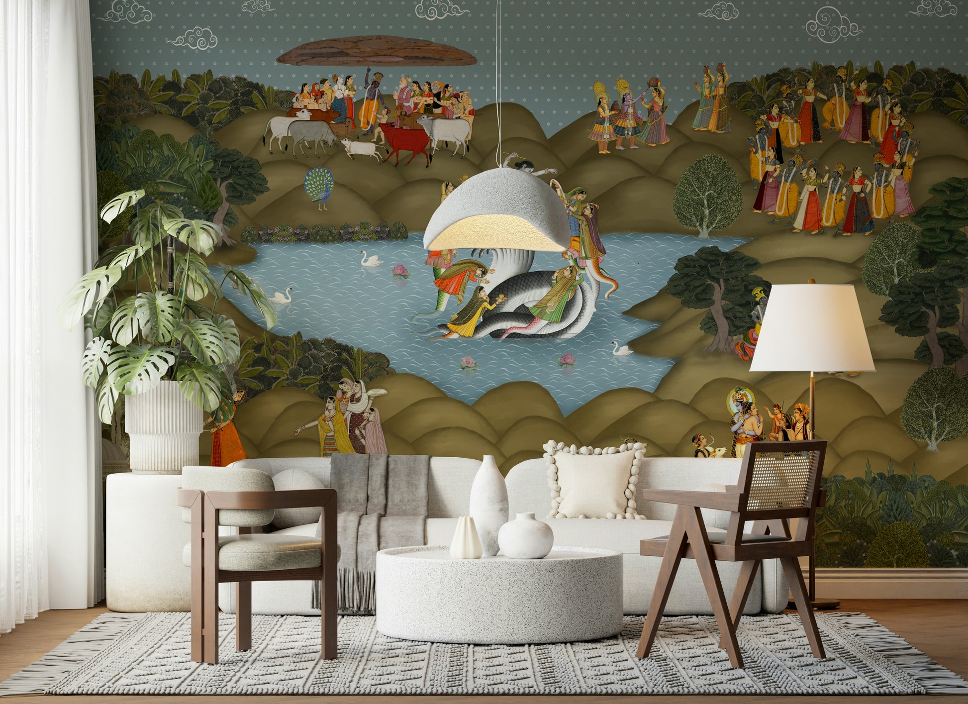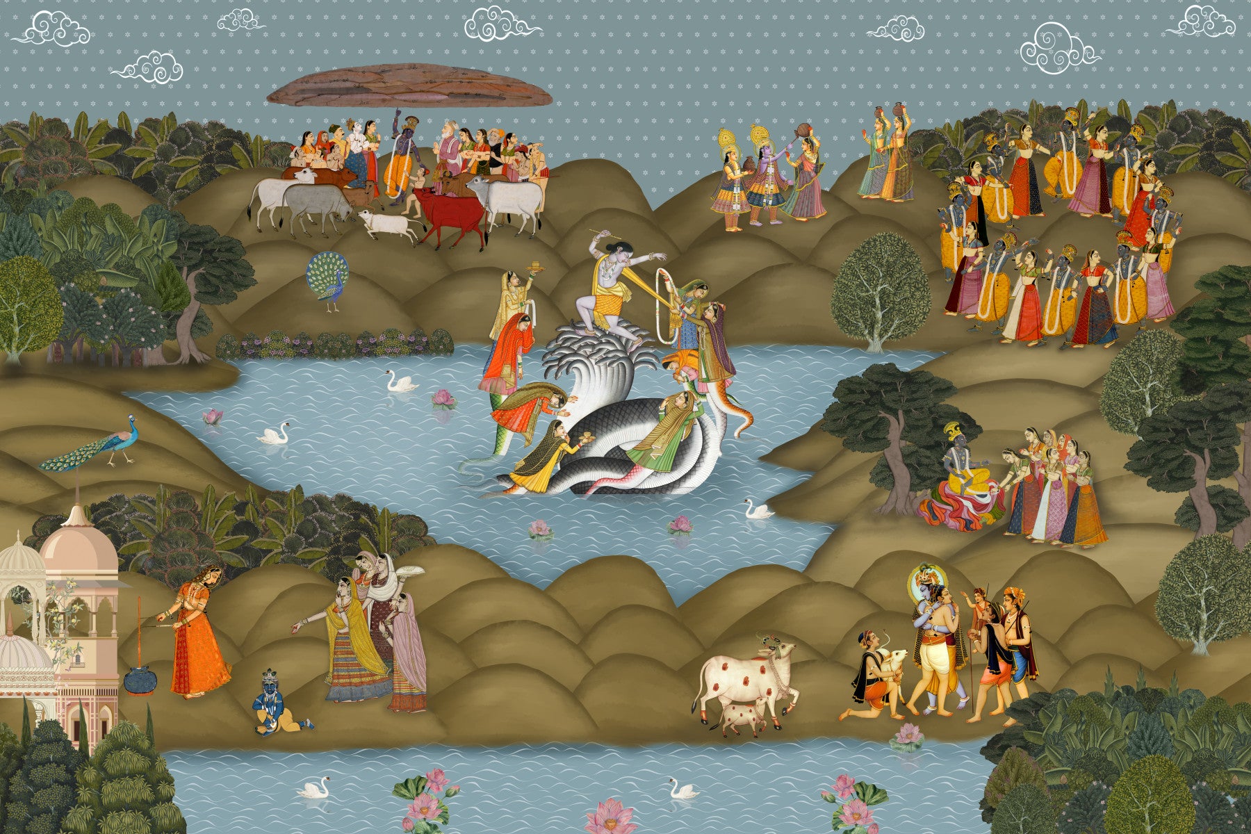Immerse yourself in the vibrant tapestry of the 'Kaliya Mardan Saga' with this breathtaking wall decor. This stunning design captures the legendary scene of Krishna's triumph over the serpent Kaliya, depicted within a rich landscape brimming with life and folklore. Observe Krishna perched atop the multi-headed serpent, subduing its power with grace and divine strength. This is beautifully contrasted by scenes of serenity and celebration; figures dance joyously, cows graze peacefully, and peacocks strut proudly among lotus-filled waters. Traditional motifs and a harmonious palette create a captivating composition that infuses any space with a sense of ancient wisdom and uplifting energy. Let this visual narrative transport you to the heart of Vrindavan, weaving a timeless tale of courage and devotion onto your walls.