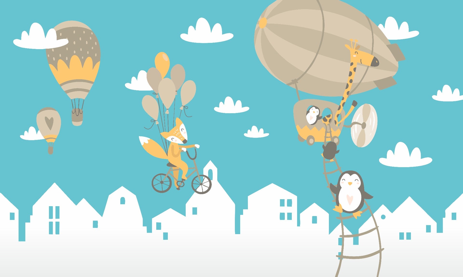 Brighten up your child's space with the enchanting Kids Air Balloon Wallpaper, featuring playful giraffes and penguins. Our wallpaper company presents this easy-to-install mural that brings a delightful scene to life, perfect for sparking imaginations. Made with 100% natural materials, this eco-friendly wallpaper ensures a safe environment for your little ones. The "Peel and Stick" feature allows for a hassle-free setup, so you can refresh a room without the need for professional help.