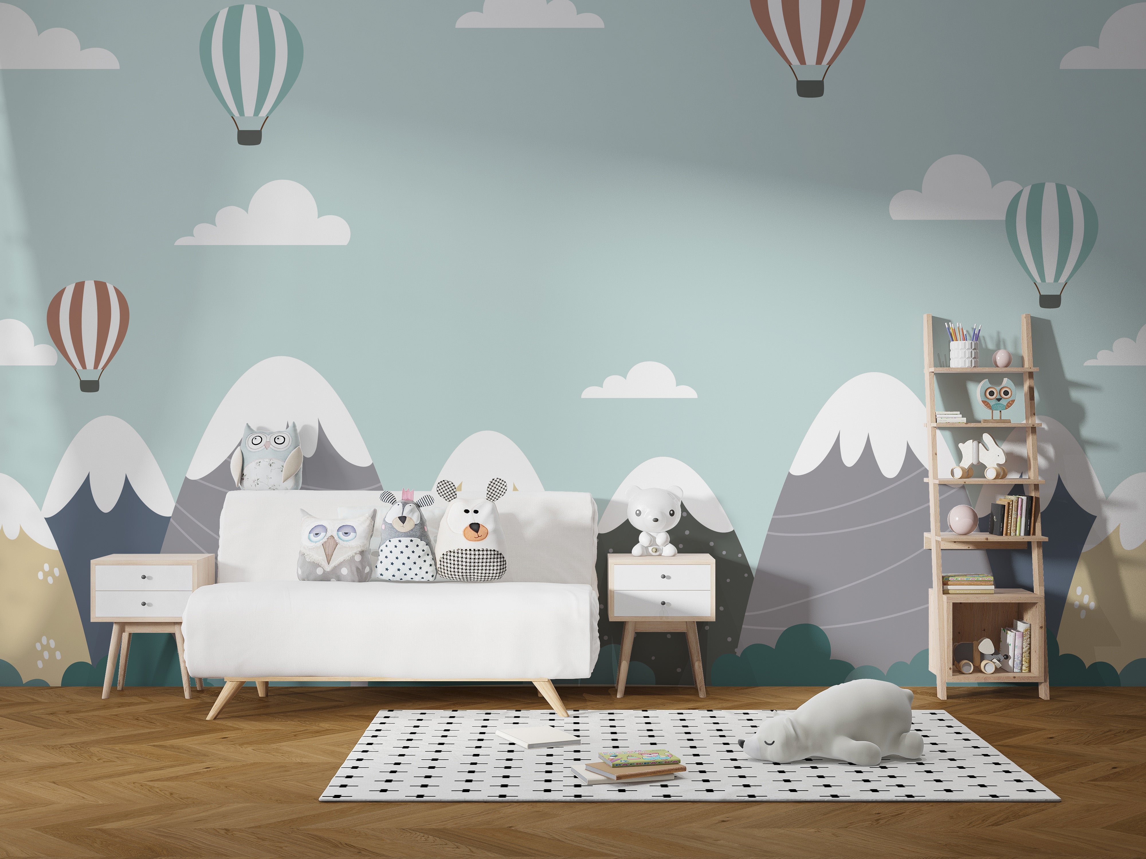 This exquisite mural wallpaper, designed for nursery settings, features an abstract portrayal of snowy mountains, creating a serene and peaceful atmosphere. The artwork is enlivened with colourful hot air balloons that add a whimsical touch, perfect for sparking the imagination of little ones. This mural's use of soothing colours and gentle contrasts brings a calming and restful vibe to the room. It's an ideal choice for parents looking to create a nurturing and imaginative environment for their children. The wallpaper's unique design enhances the nursery's visual appeal and contributes to a harmonious and relaxing mood. Its versatility allows it to blend seamlessly with various decor styles, making it a wonderful backdrop for creating lasting memories.
