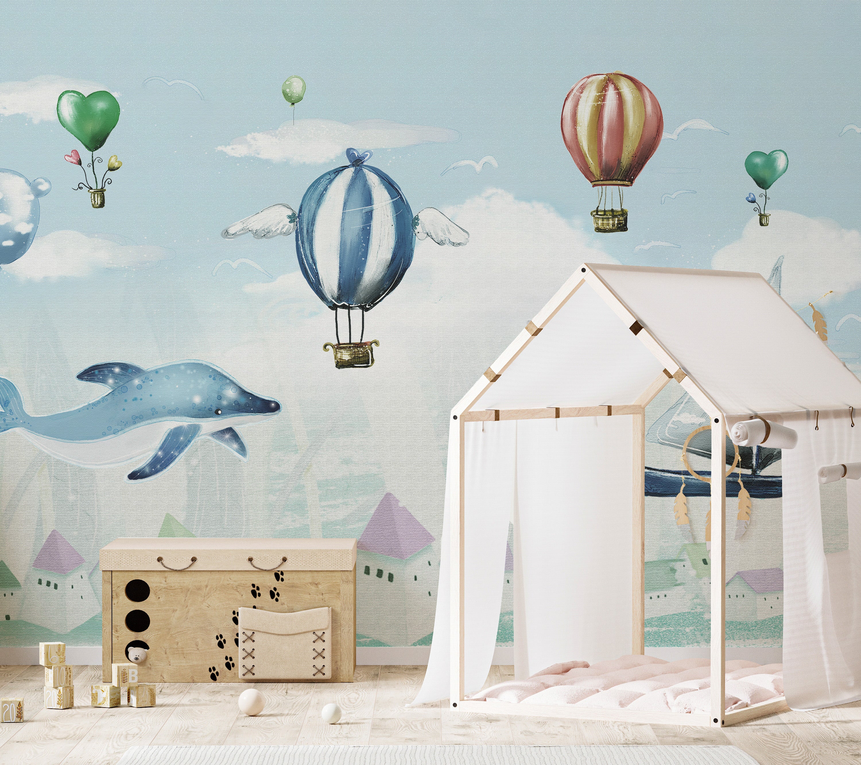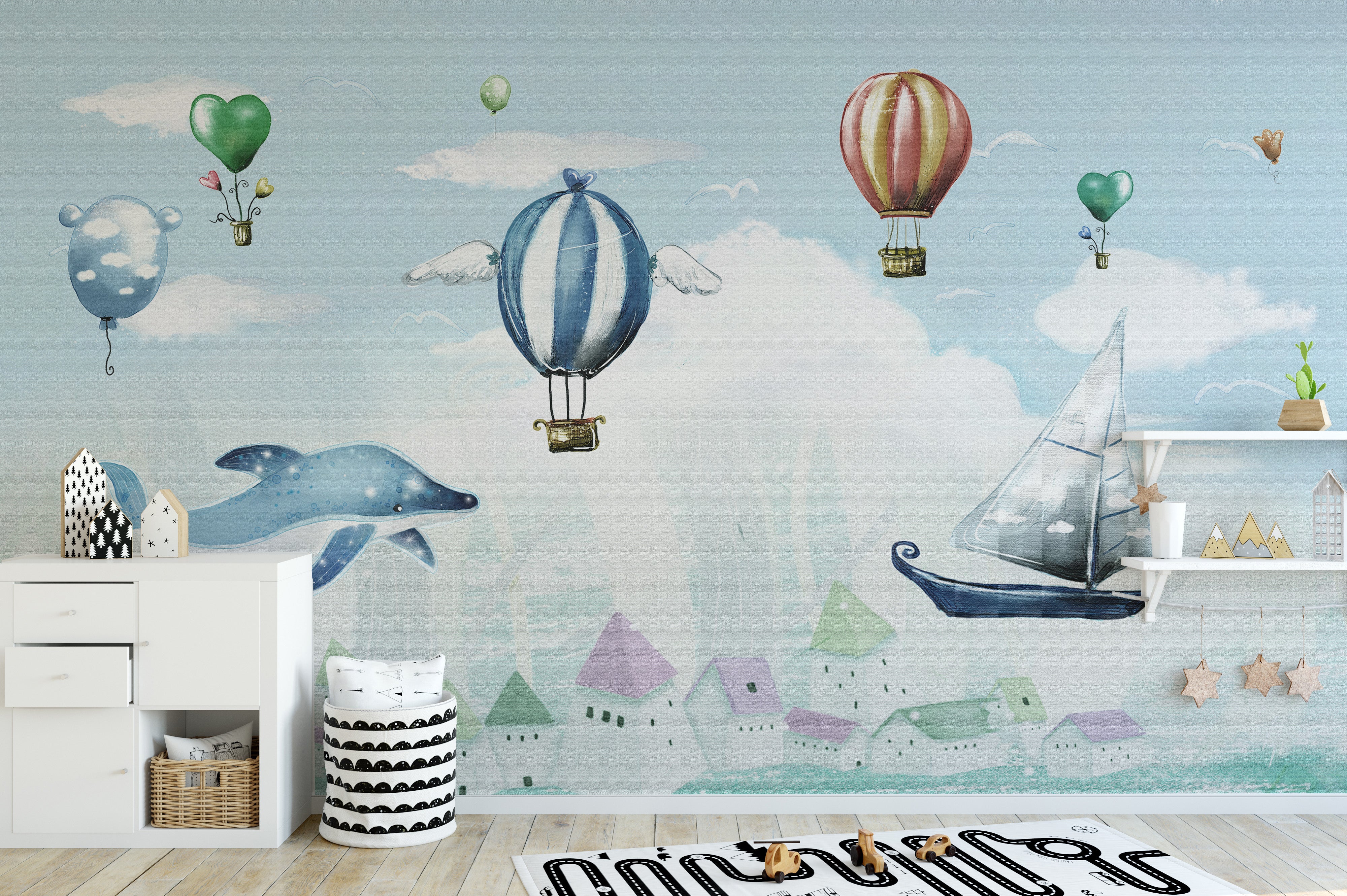 Imagine the look on your child's face when they walk into their room to see a stunning high skies adventure hot air balloon mural wallpaper bringing their walls to life! This playful wallpaper celebrates the joy of childhood with whimsical hot air balloons floating through the clouds. The intricate detailing of the balloons and the beautiful scenery below will capture their imagination and ignite a sense of adventure in their hearts. The captivating design of this hot air balloon wallpaper is perfect for any kid's room. Bring a touch of adventure to your child's space with this bold and beautiful wallpaper.
