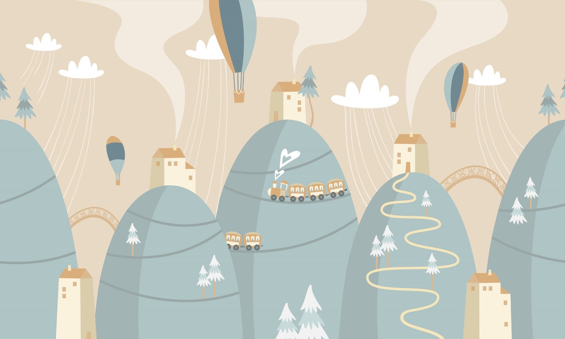 Brighten your child's world with the playful mountain with houses kids' dreamland wallpaper! This delightful design transforms their room into an enchanting escape. Featuring whimsical mountains with colorful houses, this kids mountain wallpaper invites young minds to embark on imaginative adventures. The playful landscape, set against a serene sky, sparks creativity and joy in any kid's bedroom or play area.