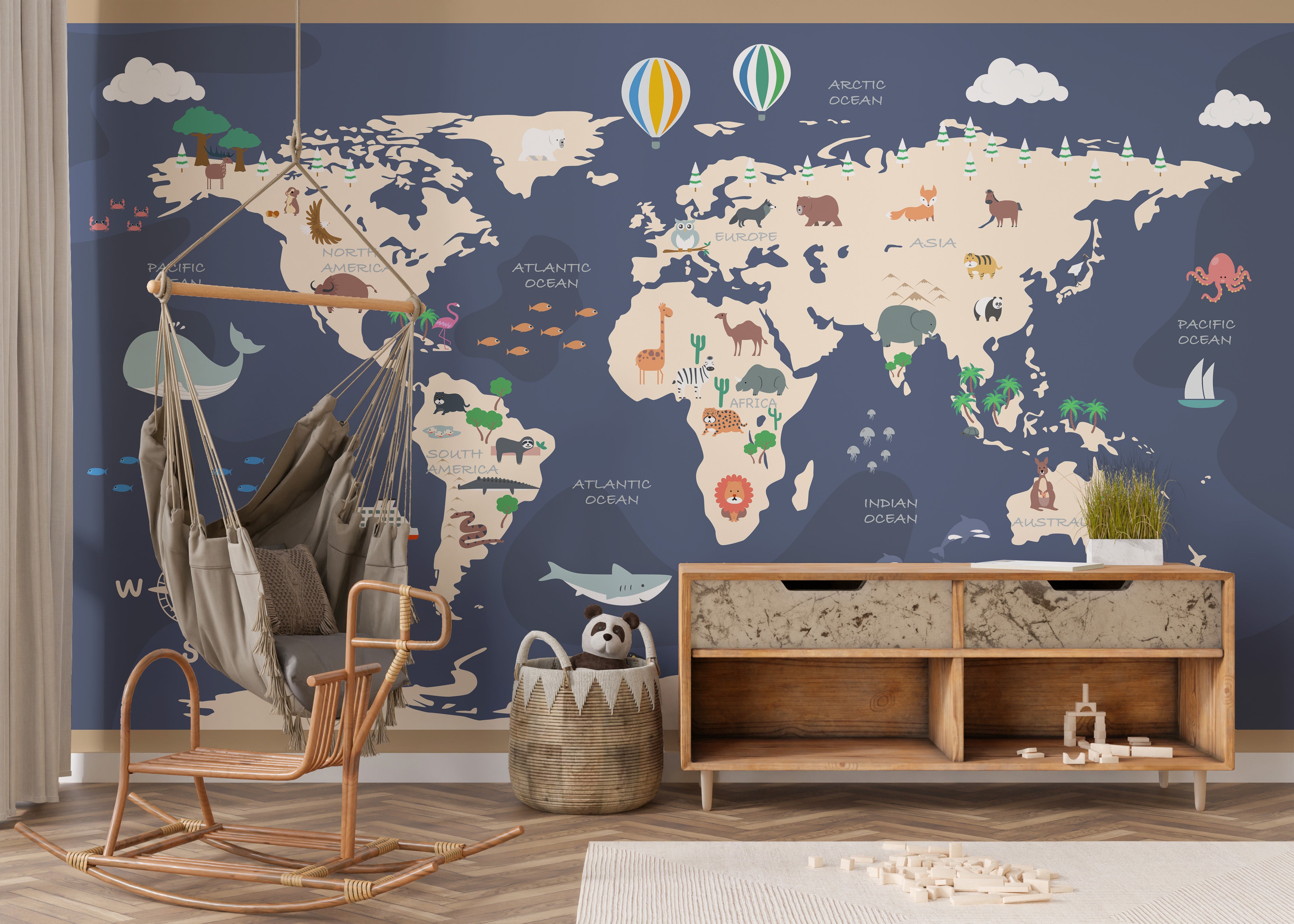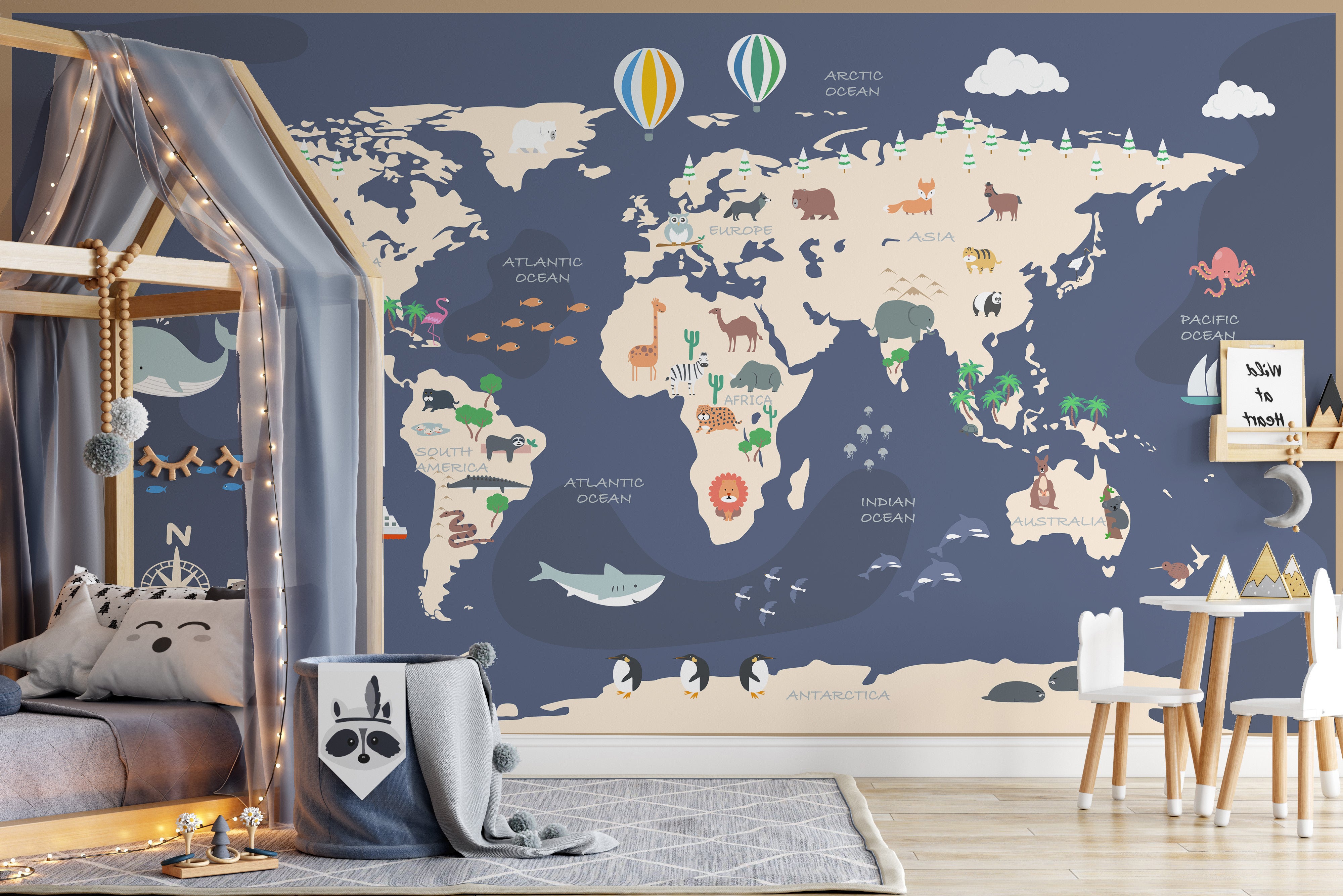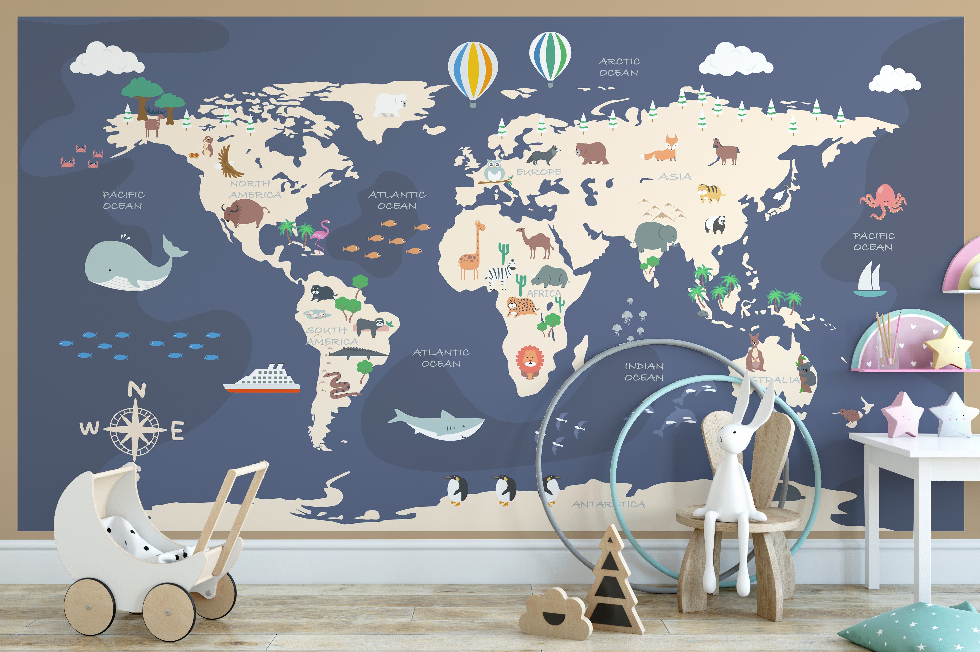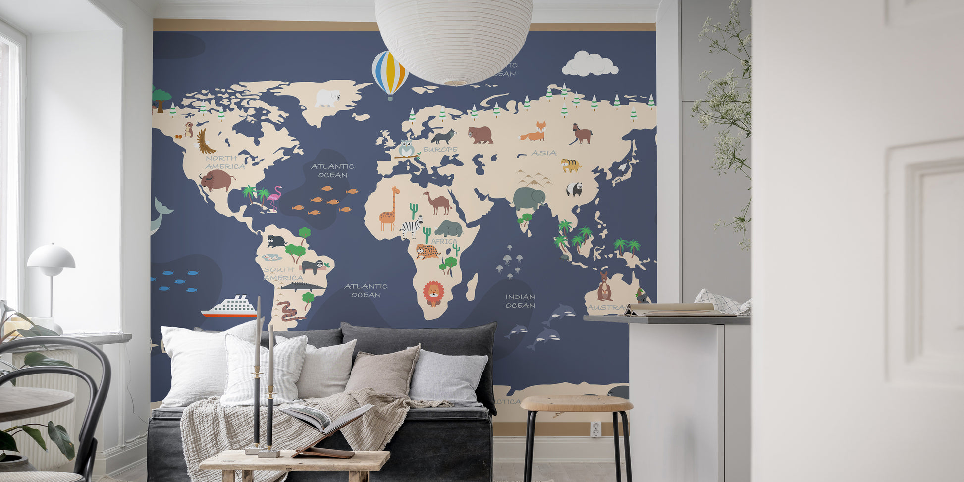 Kids World Map with Cartoon Wallpaper Mural - Giffywalls