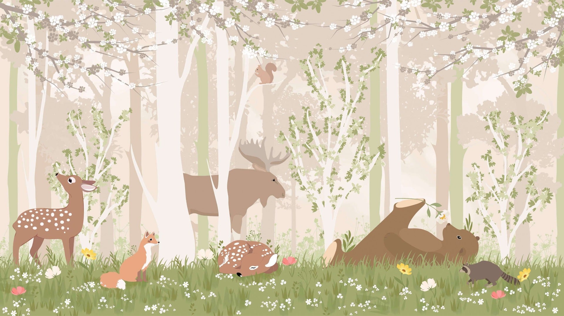 Bring the enchanting forest into your child's room. Create a playful environment in which to imagine or play adventure Encourage imagination and adventure as your child interacts daily with this lively scene For play, storytime or rest the soft colors and gentle illustrations provide a calming backdrop This mural encourages a love for nature, making it perfect for nurseries, playrooms, or bedrooms. Easy to apply, this mural instantly enhances any space, offering both style and fun Encourage creativity and a sense of wonder through the delightful characters and serene forest backdrop. Turn your child's room into a wooded wonderland!
