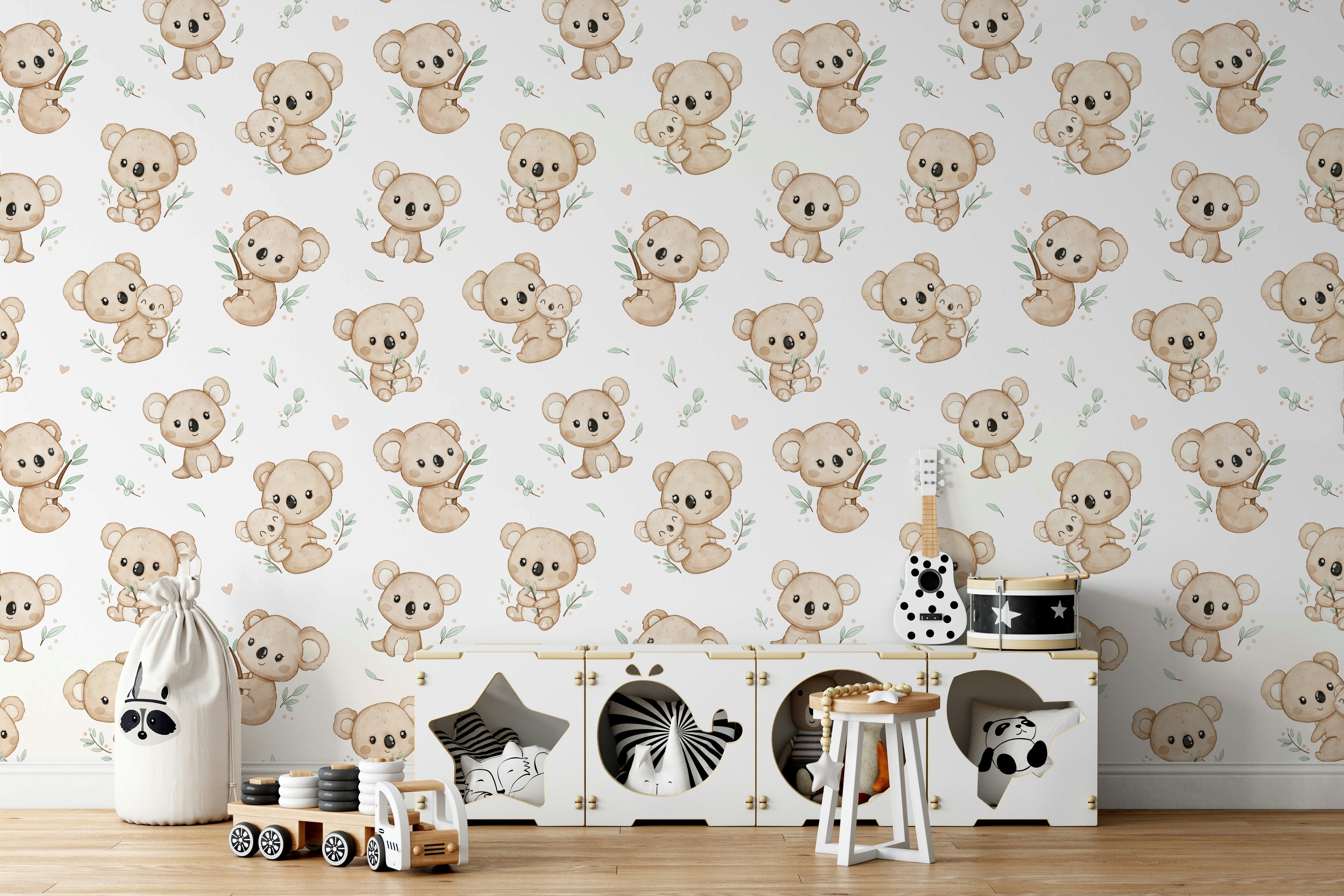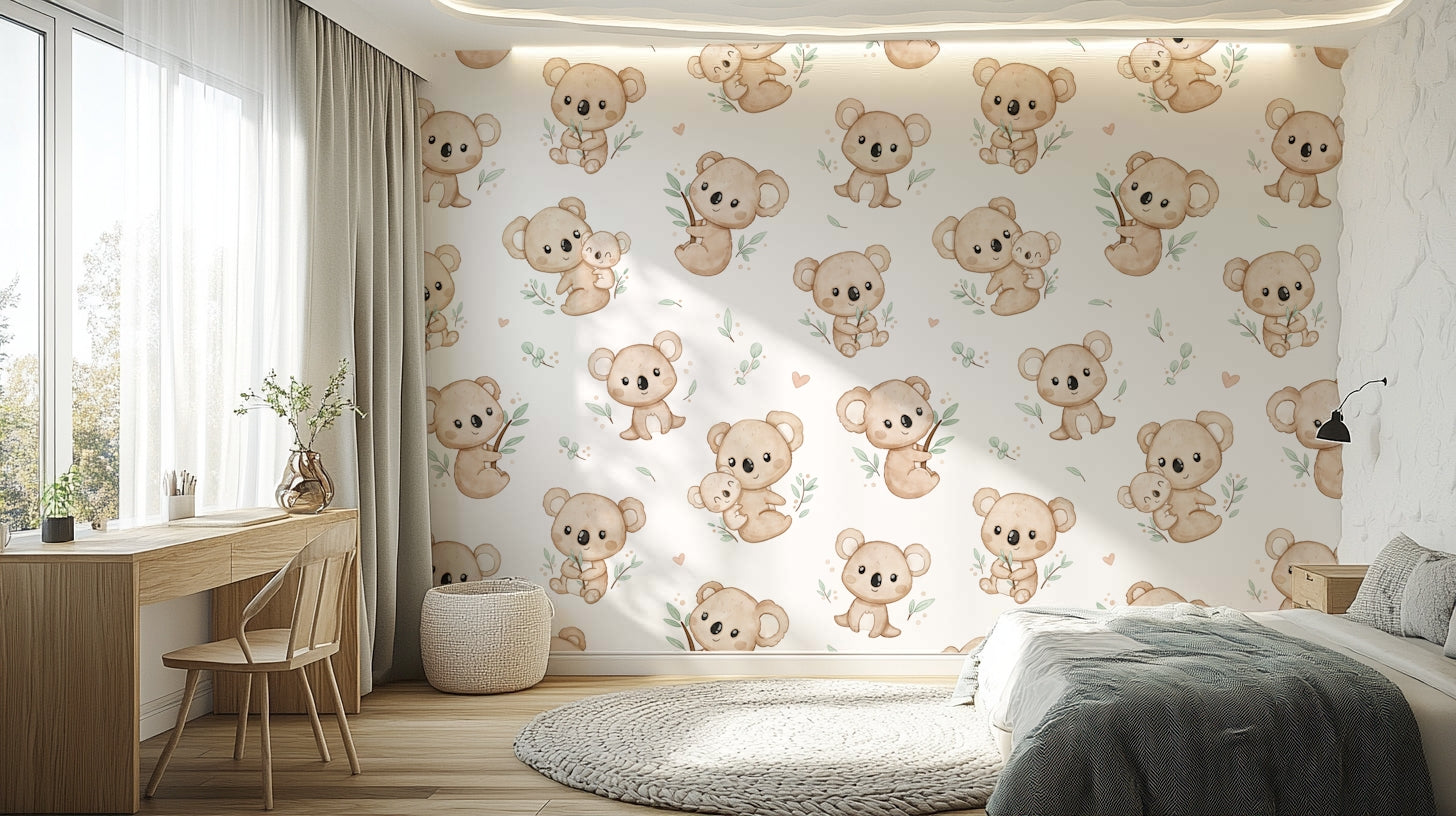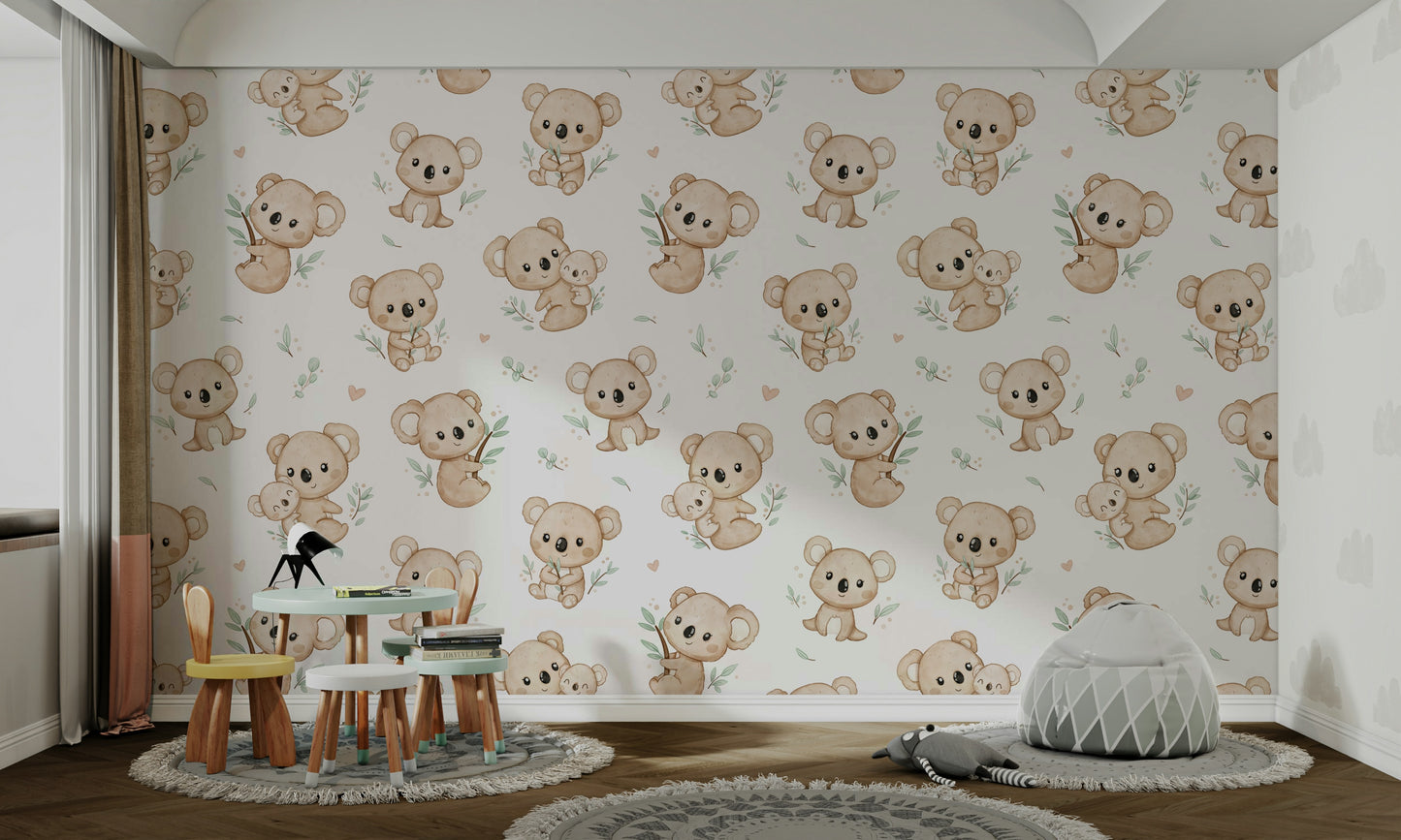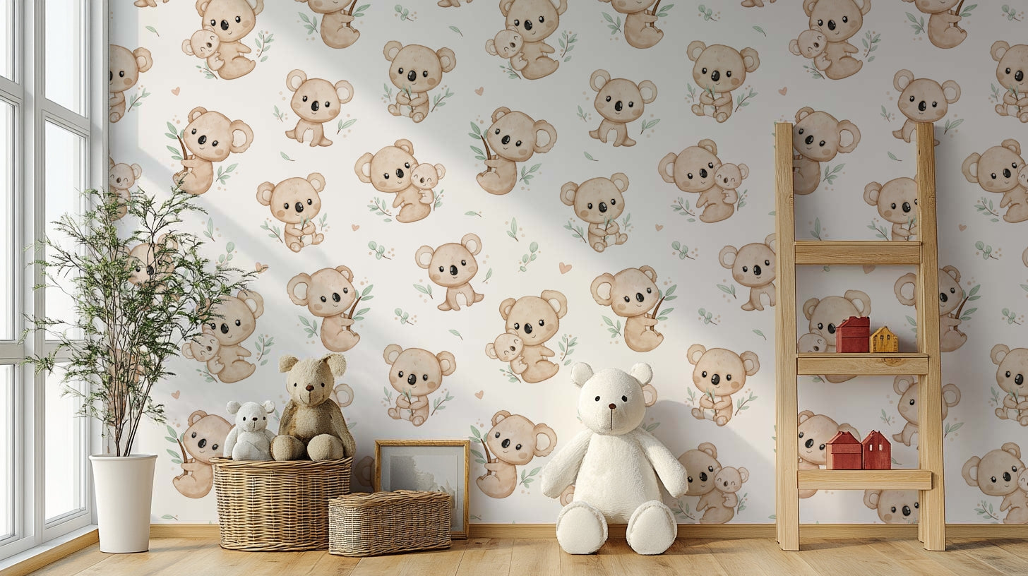 Bring a touch of whimsy and warmth to any room with Koala Cuddles wallpaper. Featuring adorable koalas nestled among eucalyptus leaves, this charming design is perfect for creating a cozy, inviting atmosphere. Ideal for nurseries or children's rooms, it adds a playful yet soothing element to your decor. Let these cuddly creatures inspire joy and comfort, making every day feel like a delightful retreat to the Australian bush. Add character and charm to your walls with this enchanting koala pattern.
