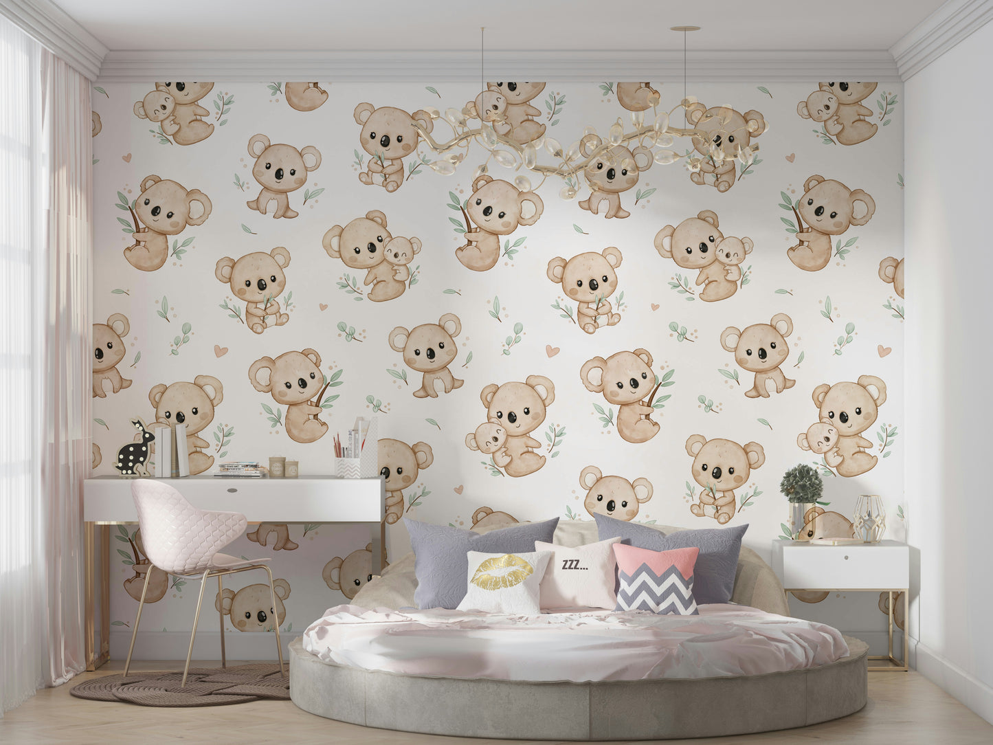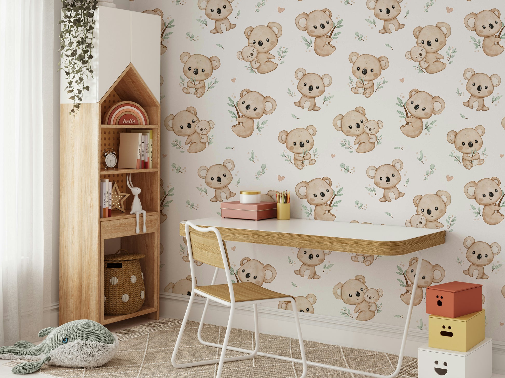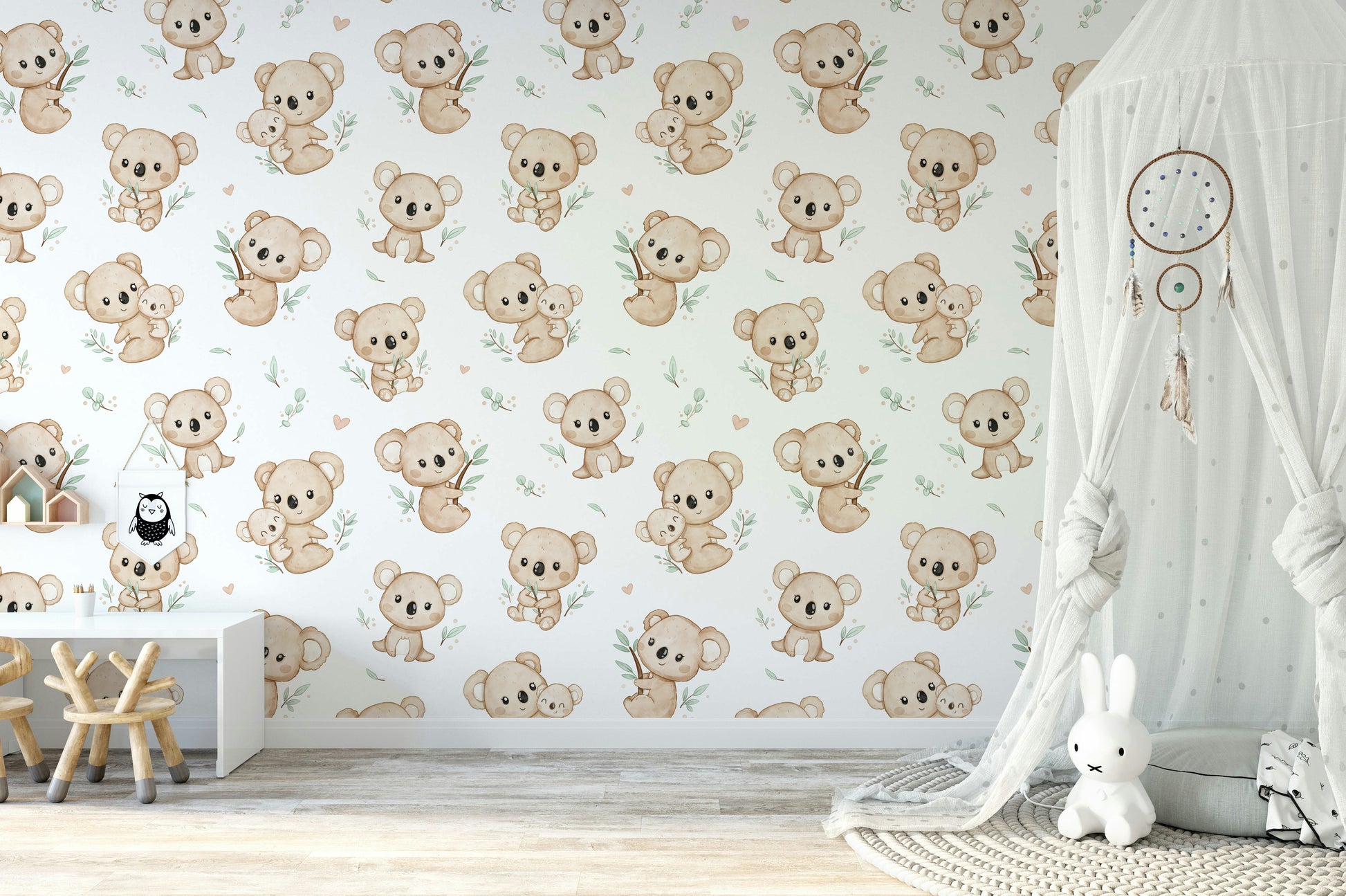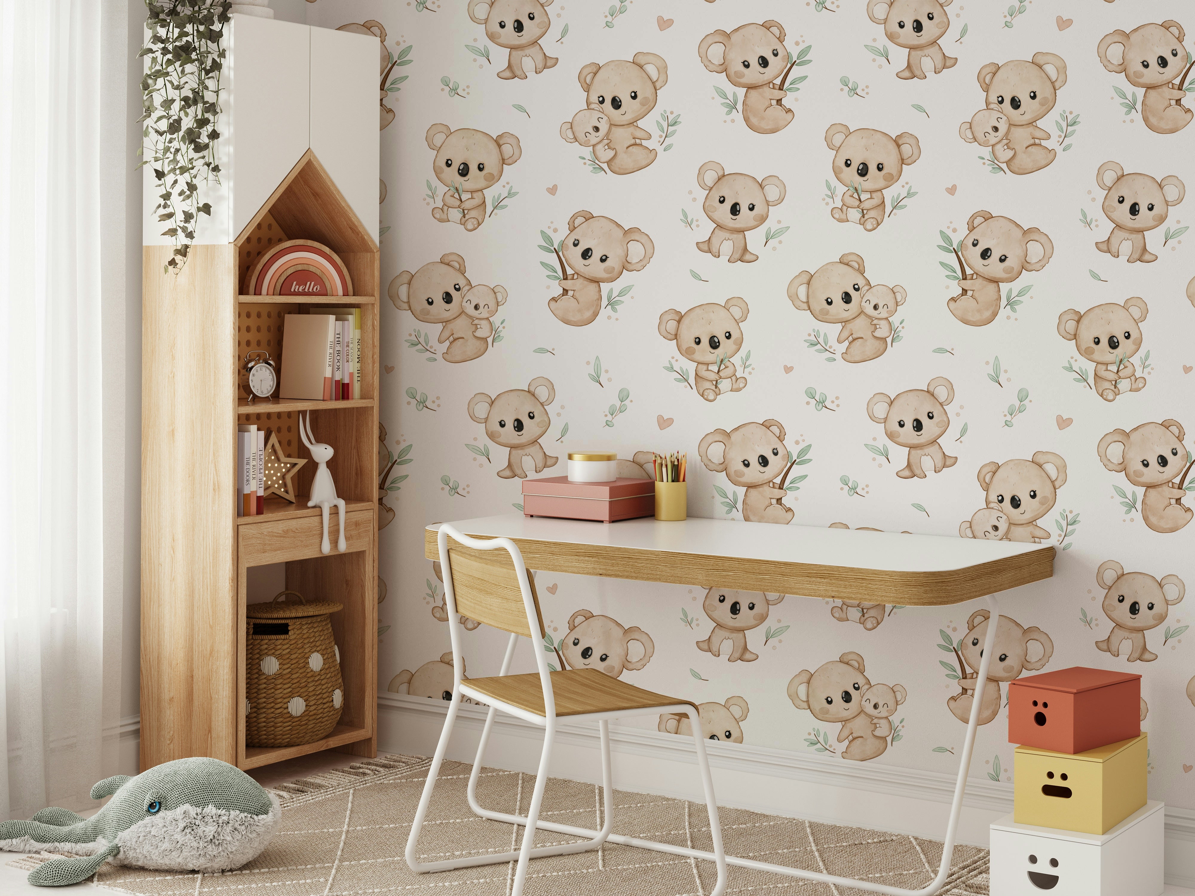 Bring a touch of whimsy and warmth to any room with Koala Cuddles wallpaper. Featuring adorable koalas nestled among eucalyptus leaves, this charming design is perfect for creating a cozy, inviting atmosphere. Ideal for nurseries or children's rooms, it adds a playful yet soothing element to your decor. Let these cuddly creatures inspire joy and comfort, making every day feel like a delightful retreat to the Australian bush. Add character and charm to your walls with this enchanting koala pattern.