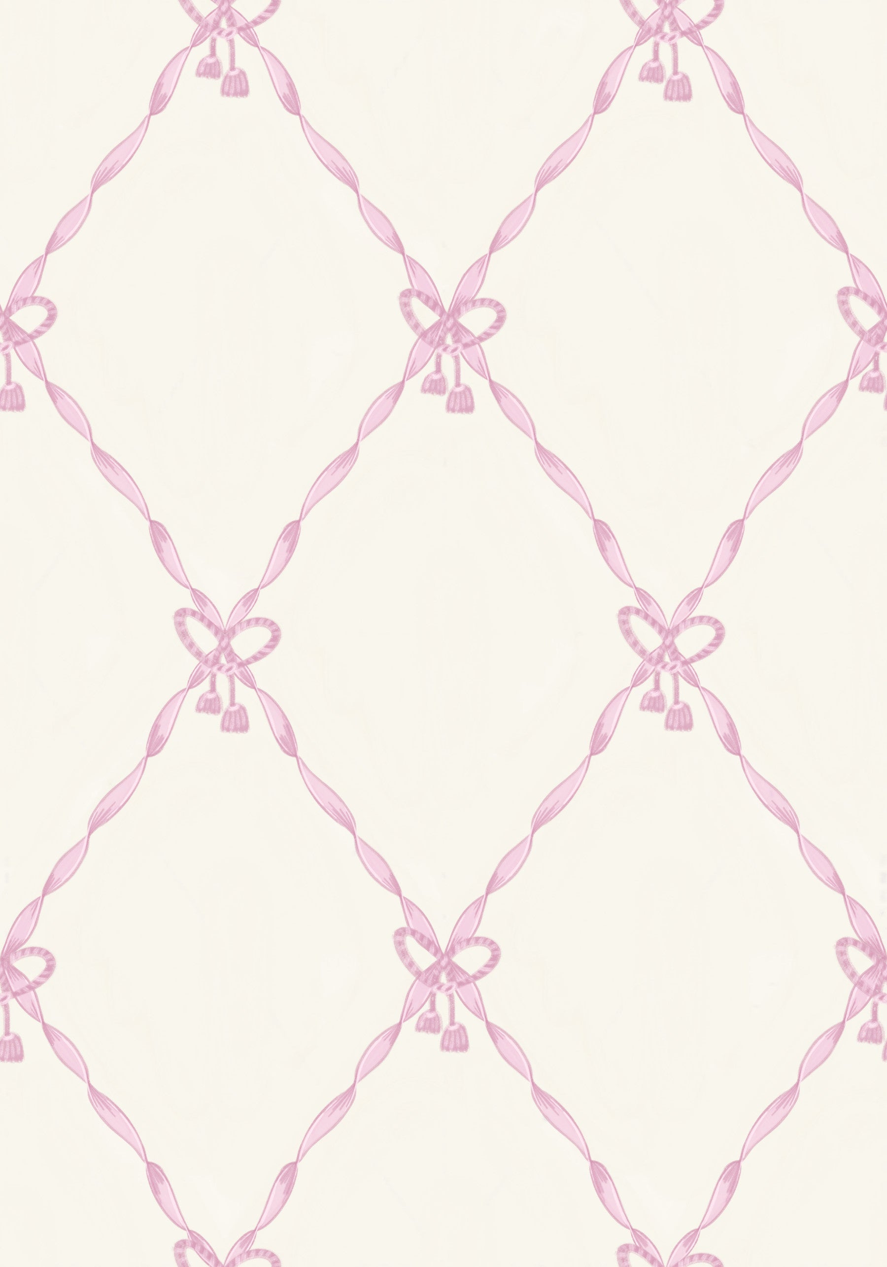This wallpaper brings a touch of vintage elegance. It features a continuous pattern of interlocking diamonds, created with delicate pink ribbons tied into bows and finished with charming tassels. The off-white background allows the pink details to stand out, making this a subtle yet refined wallpaper for walls. Ideal for living rooms, dining rooms, or hallways, it adds a sophisticated, romantic vibe to any interior space.