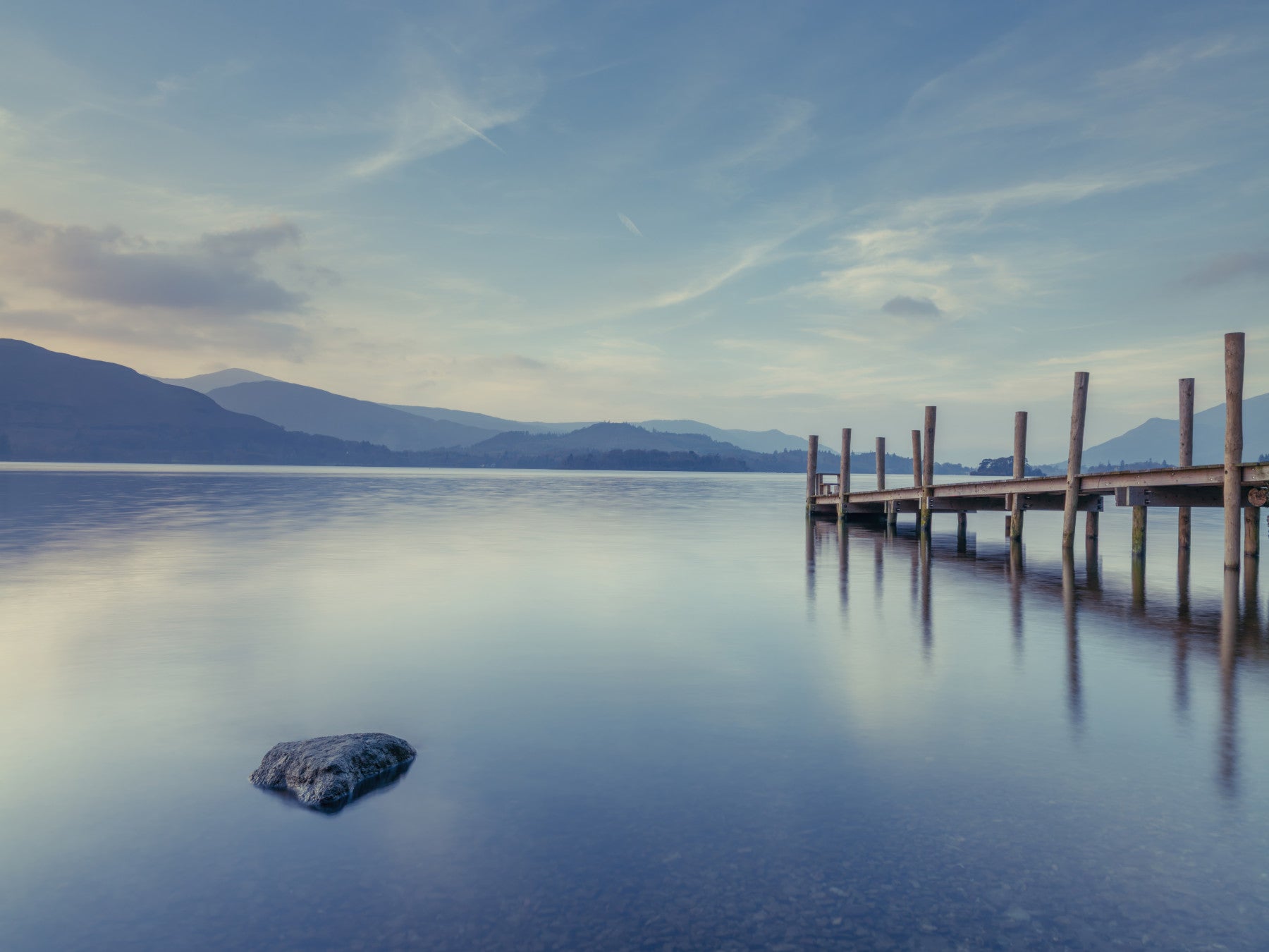 Pier on still lake. Immerse yourself in the tranquility of this landscape scene. Pale blues and greys meet wood tones, creating a calming vista of a still lake meeting distant mountains. The wooden pier adds a touch of rustic charm. This wallpaper for walls works wonders in bedrooms, bathrooms, or any space where relaxation is key. Let the serene color palette and peaceful composition transform your interiors into a haven of calm, creating a visually soothing and balanced atmosphere.