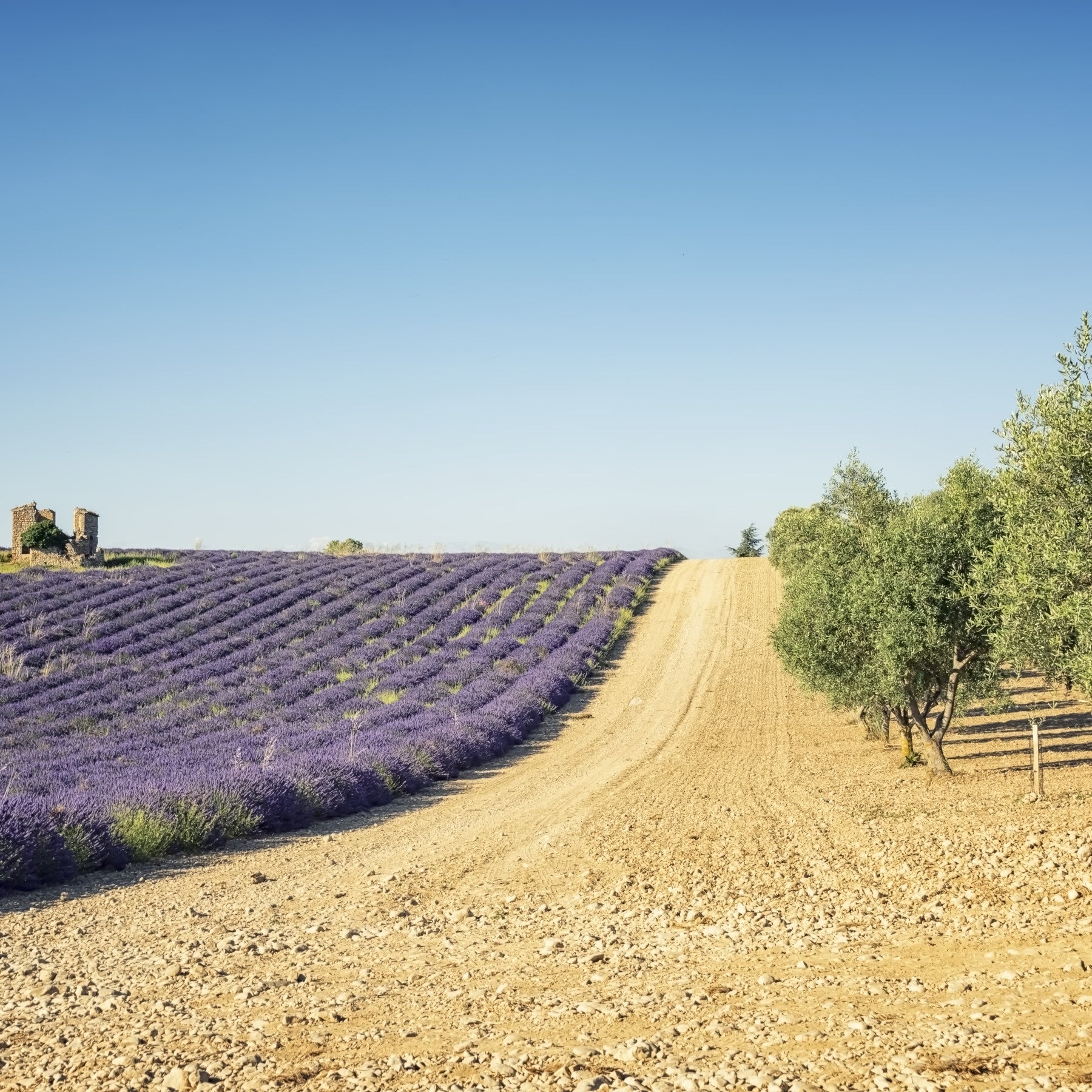 This wallpaper showcases the harmonious coexistence of nature's beauty in the French countryside. A vibrant field of lavender gently slopes towards a dirt path, framed by lush olive trees. The contrast between the purple lavender, the earthy tones of the path, and the green olive leaves creates a balanced and visually appealing scene. A crumbling stone structure adds a touch of history and rustic charm. The scene is peaceful, evoking a sense of calm and serenity.