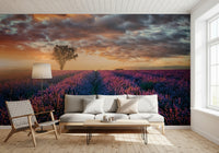 Infuse your space with the tranquil beauty of a lavender field at dawn. This wallpaper for walls captures a serene landscape, bringing a touch of the countryside into your home. A lone tree stands sentinel over rows of purple blooms, illuminated by a warm, golden sky. The soft colour palette creates a calming atmosphere, making it ideal for bedrooms, living rooms, or any space where you seek relaxation. Its subtle elegance enhances your interior, offering a visual escape and complementing both modern and classic décor.