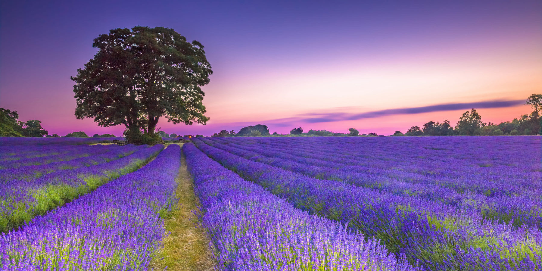 Experience the magic of golden hour in a breathtaking lavender field. The warm, golden light of the setting sun casts a magical glow on rows of deep purple lavender, creating a scene of unparalleled beauty. A single, majestic tree stands at the edge of the field, adding a sense of scale and serenity to the composition. The soft, diffused light creates a sense of tranquility, perfect for creating a peaceful and inviting atmosphere in your home or office. This wallpaper offers a stunning visual experience that will transport you to a world of tranquility.