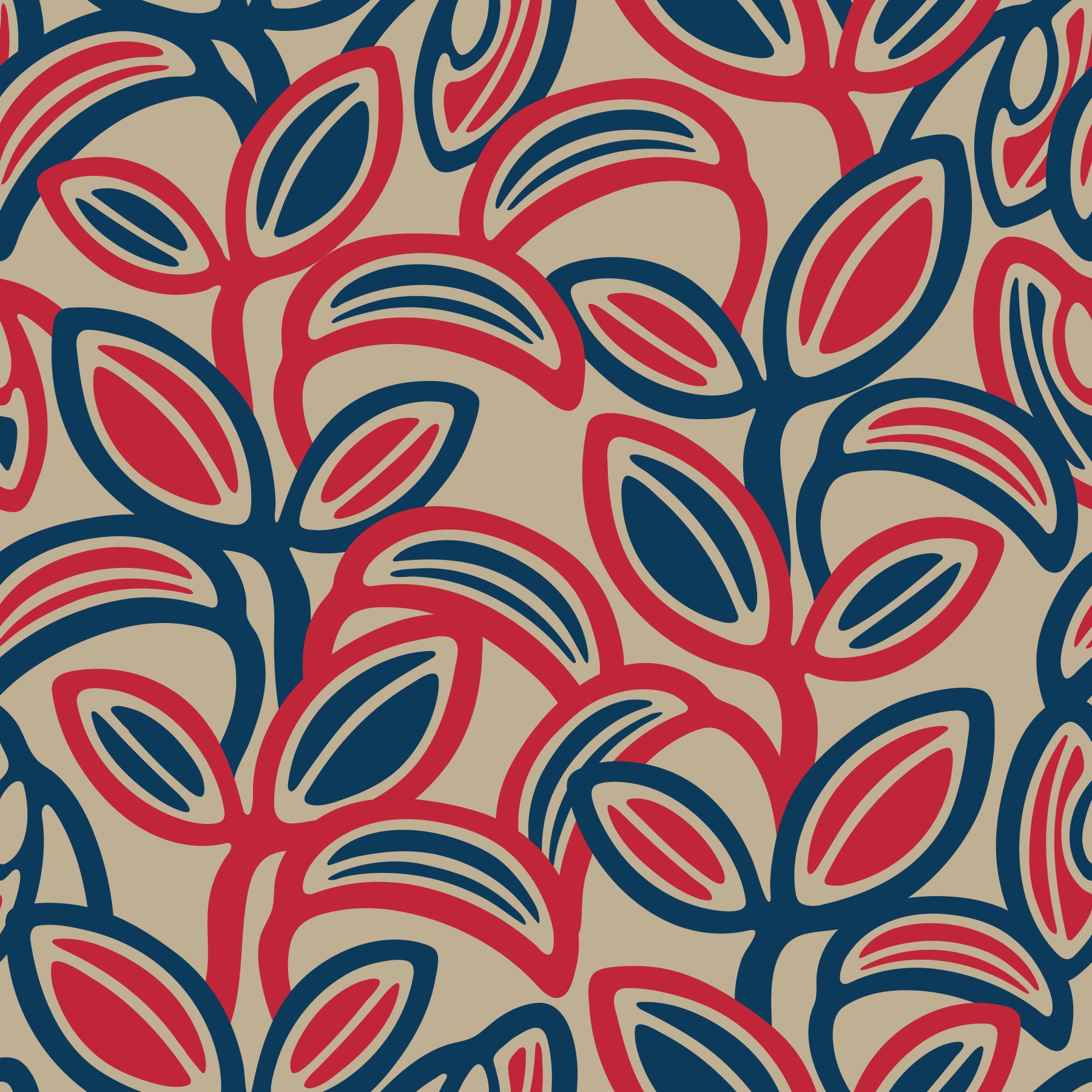 Surround yourself with the Mid Century Modern retro groovy style of this Leaf Laugh Love botanical wallpaper that radiates positive energy. This design features an organic pattern of stylized leaves in a vibrant vintage color palette showcasing bright red and navy blue on warm sand beige. The groovy free-flowing shapes evoke a sense of Summer carefree joy, reminiscent of the optimistic spirit of the 1970s. Let this wallpaper inspire laughter, love and good vibes in your space with its playful yet sophisticated design and pop of bright graphic color. This pattern design is also available in Other Colourways too! Original wallpaper pattern design by Jackie Tahara of UnBlink Studio.