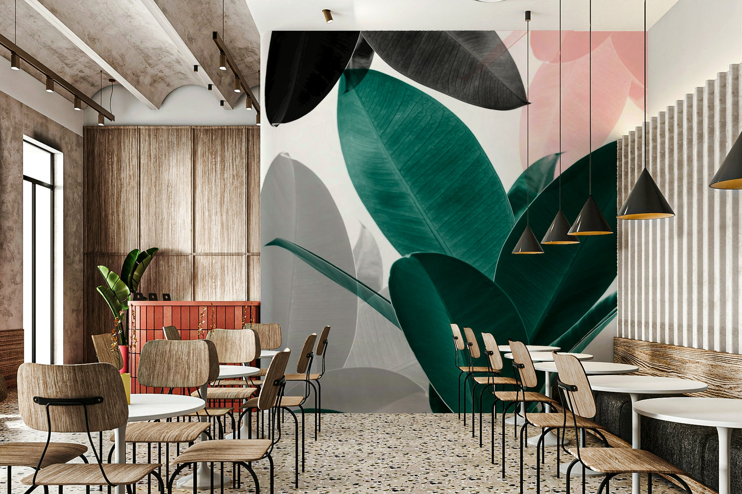 Immerse yourself in the serene beauty of overlapping leaves. This design presents a lush arrangement of rubber plant leaves in deep green, contrasted by soft pink and monochromatic tones. This wallpaper for walls adds a modern botanical touch to your space. Perfect for creating a calming atmosphere in a living room, bedroom, or even a home office. The subtle color palette blends smoothly with various interior styles, offering a sophisticated, natural accent.