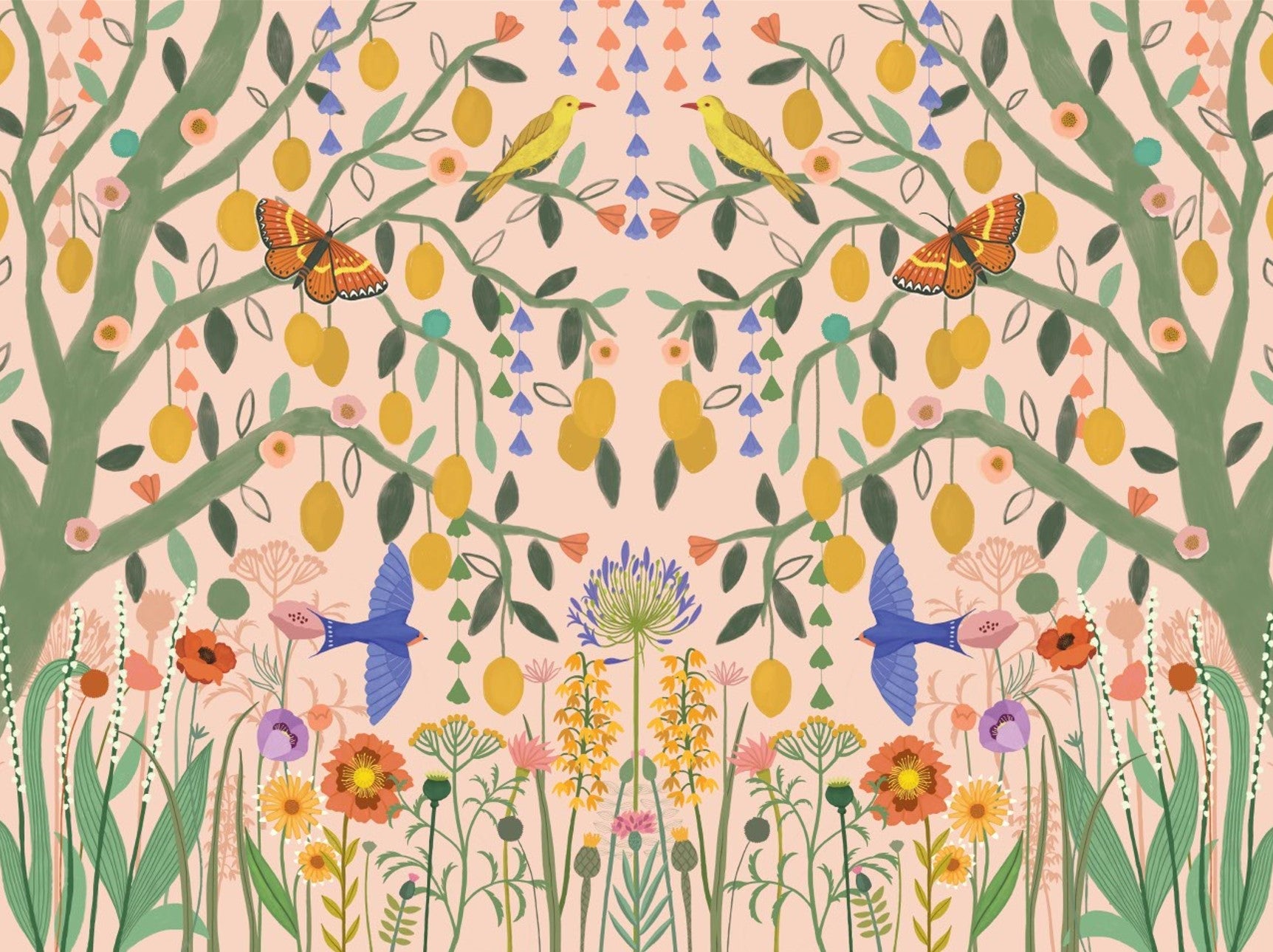 Fresh citrus tree wallcovering for a nursery with organic cotton textiles and timber toys.