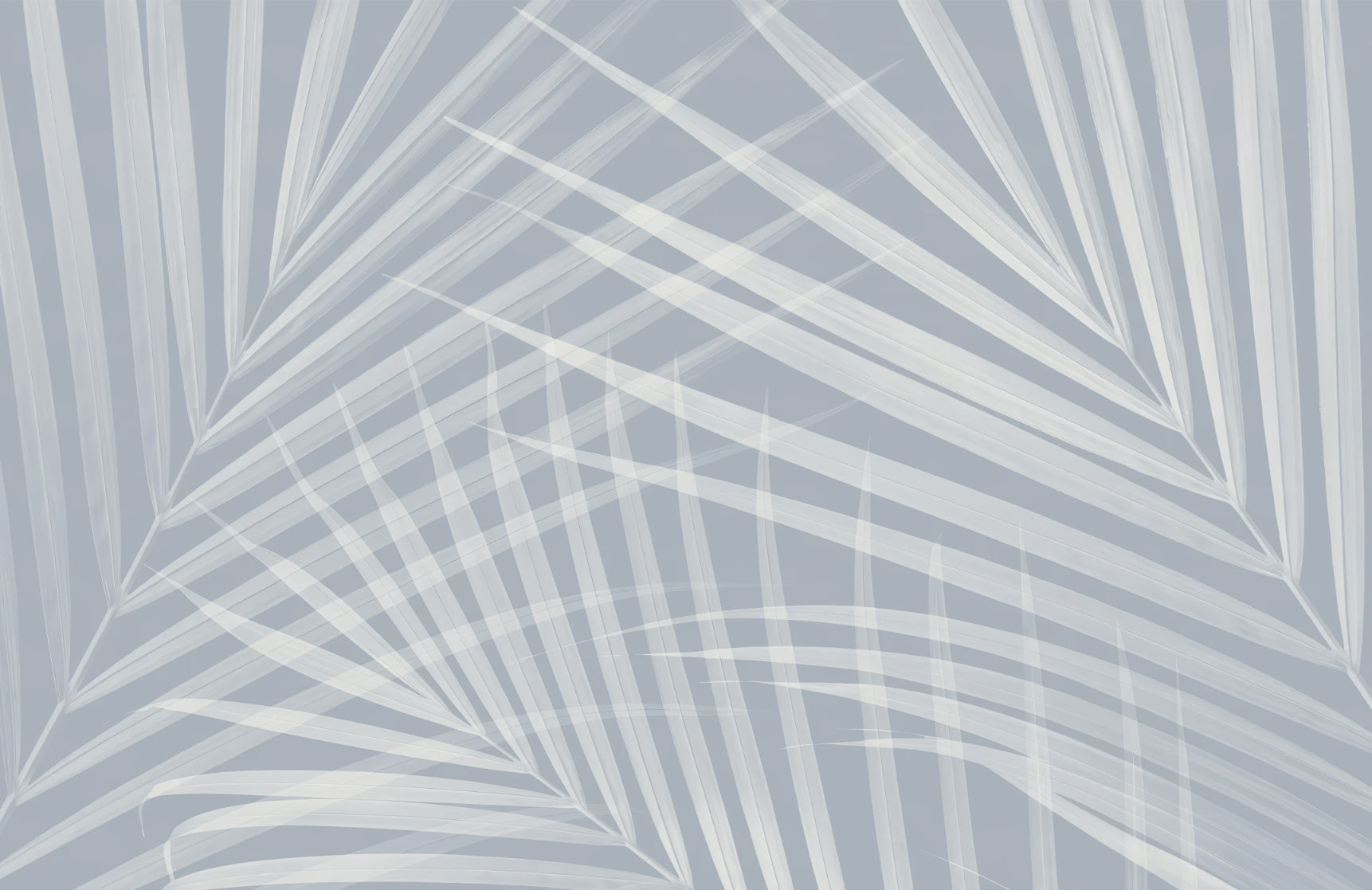 Peaceful light blue palm leaves mural wallpaper for serene bedrooms.