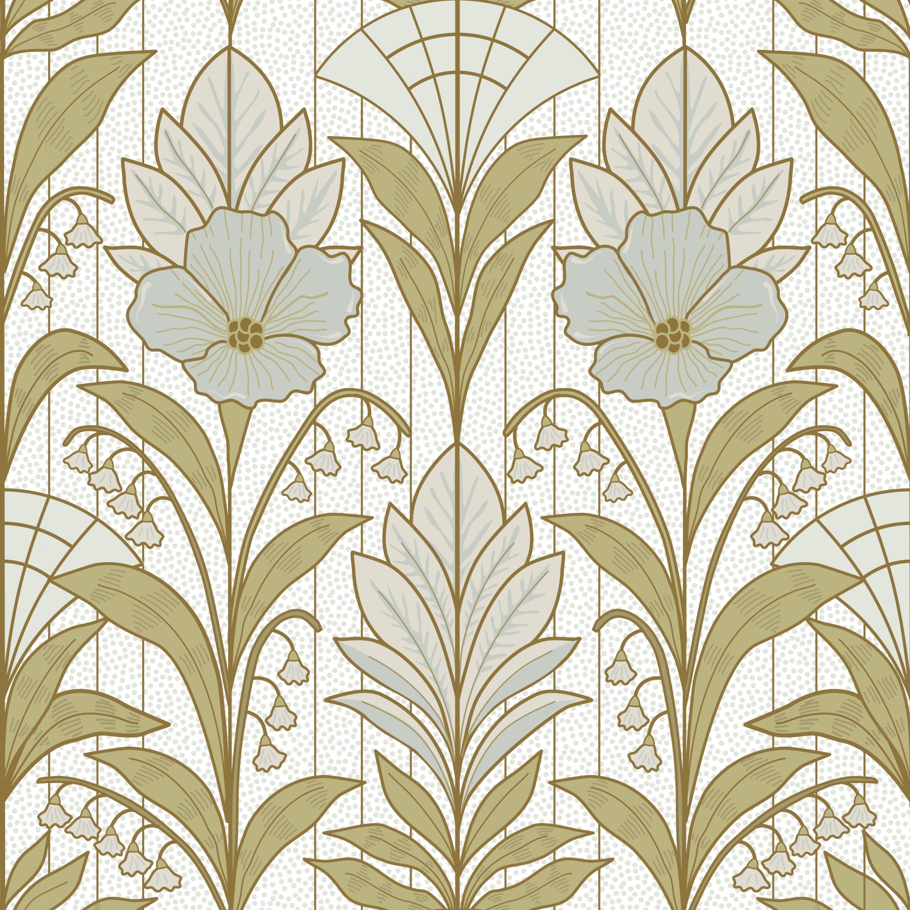 Immerse yourself in the understated glamour of the Light Lily of the Valley Art Deco Elegance wallpaper. This design delicately marries the organic beauty of lily of the valley with the geometric precision of the Art Deco era. The wallpaper features stylized floral motifs, with blooming lily of the valley cascading alongside elegantly structured leaves and subtle, geometric fan shapes reminiscent of classic Art Deco architecture. A soft, muted color palette of creams, light greens, and delicate blues evokes a sense of serene sophistication. The background of subtle dots adds depth and texture, enhancing the overall visual appeal. Perfect for creating a tranquil yet refined ambiance, this wallpaper is ideal for spaces where you seek to blend natural beauty with timeless design.
