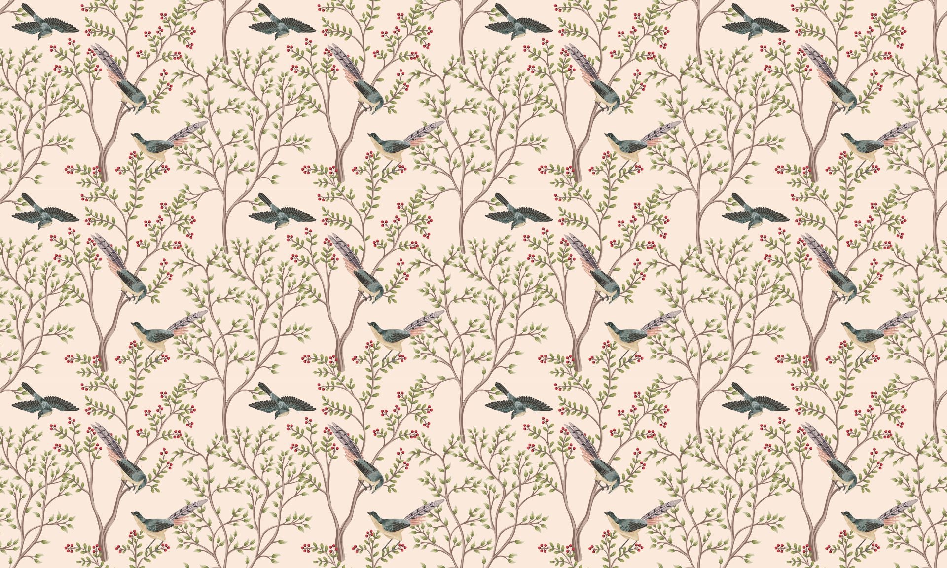The chinoiserie birds and foliage blush pink colour mural wallpaper is an enchanting blend of natural beauty and artistic tradition. This bird wallpaper captures the chinoiserie design's delicate allure through its elegant depiction of avian life amidst flourishing branches. The soft blush pink backdrop creates a serene canvas for the vivid greens of the leaves and the rich, varied hues of the birds in mid-flight and at rest. Each feather and leaf are rendered with precise detail, offering a sense of movement and vitality. This chinoiserie wallpaper celebrates nature and art, inviting a sense of grace and elegance to any room it adorns. It's perfect for those who appreciate the intricate beauty of traditional design and the timeless appeal of nature's artistry.