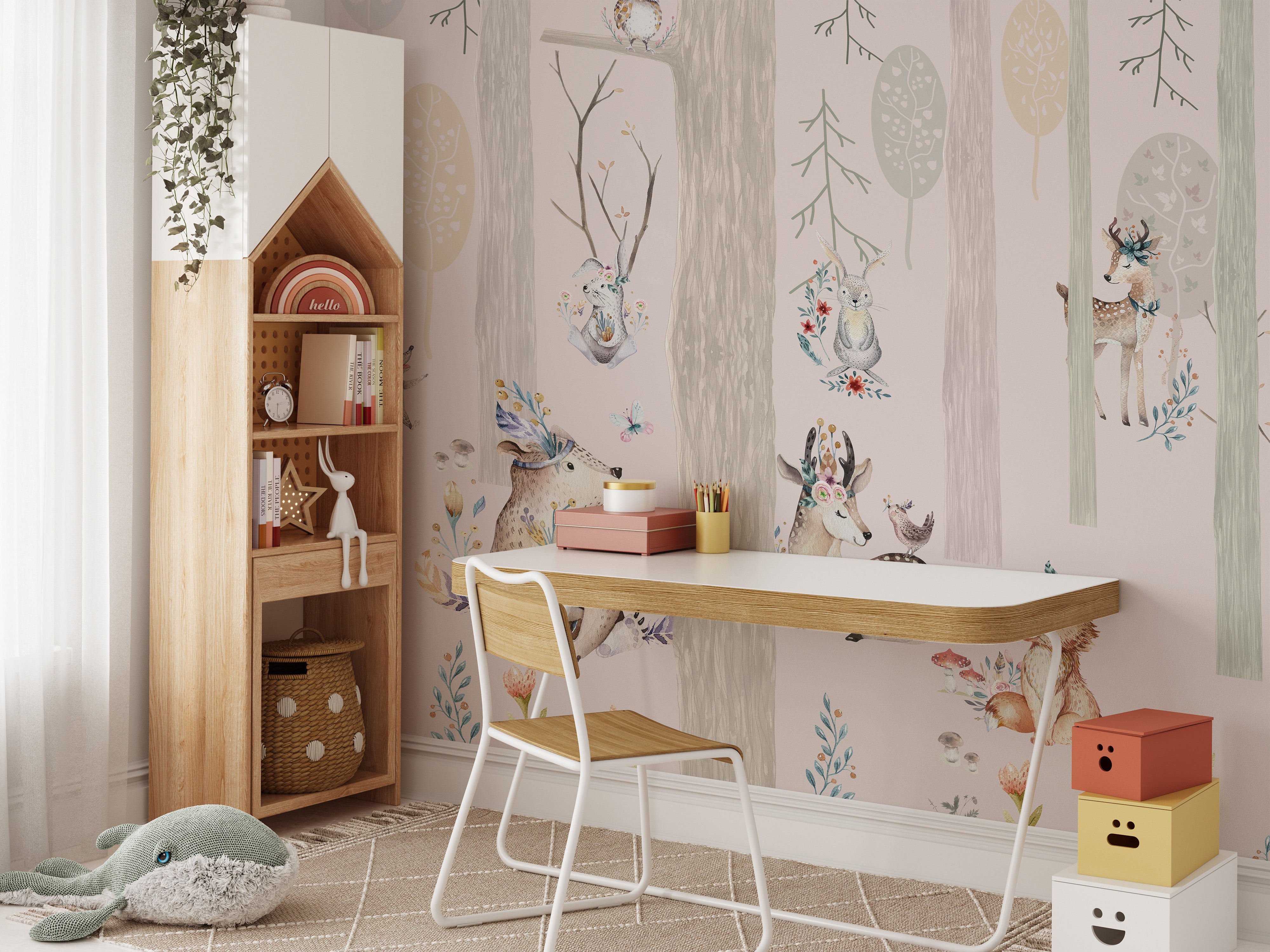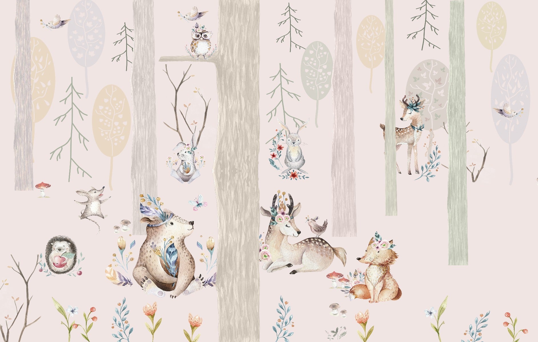 The girl's room's magical pink colour forest with animal mural wallpaper offers a charming escape into an enchanted woodland scene. Soft pink hues set the stage for various forest creatures, rendered in gentle strokes and surrounded by whimsical flora. Delightful details, such as a wise owl perched on a branch, a deer adorned with floral patterns, and a playful fox, bring this pink wallpaper to life. The mural is ideal for a playroom or bedroom, creating a sweet and serene backdrop that encourages creativity and imagination. With its storybook quality, this wallpaper is a heartwarming addition, perfect for surrounding little ones with the beauty of nature and the magic of fairy tales.