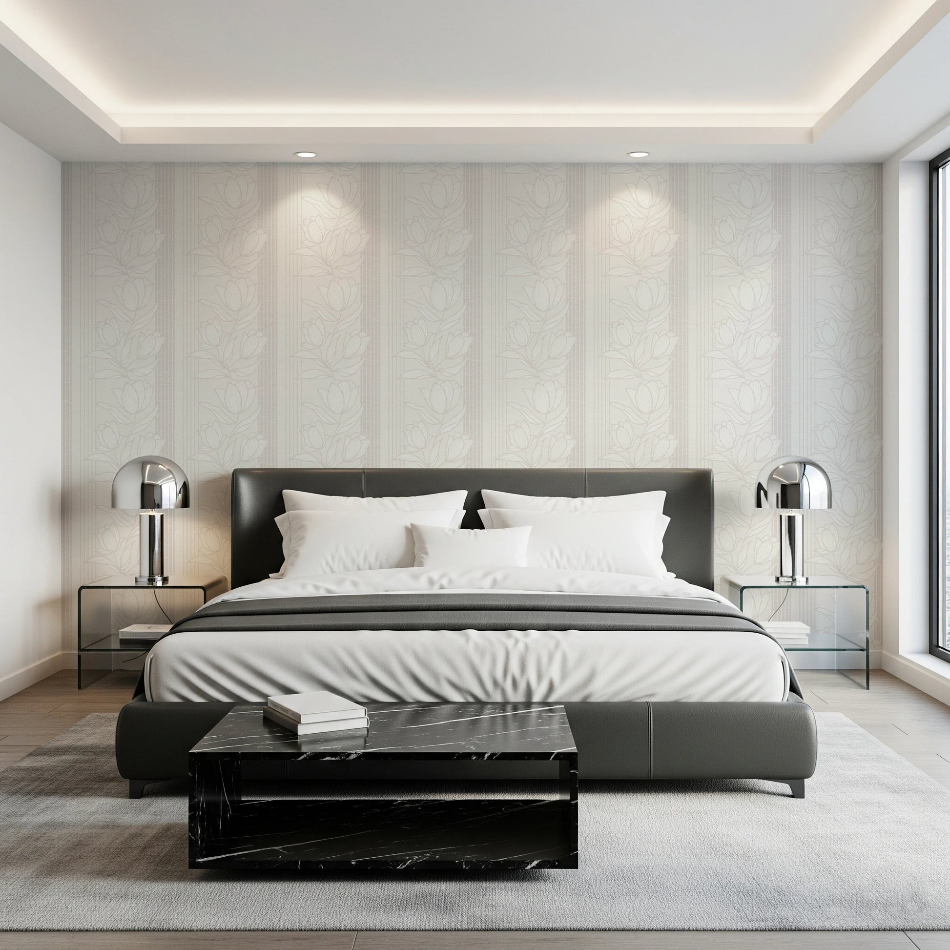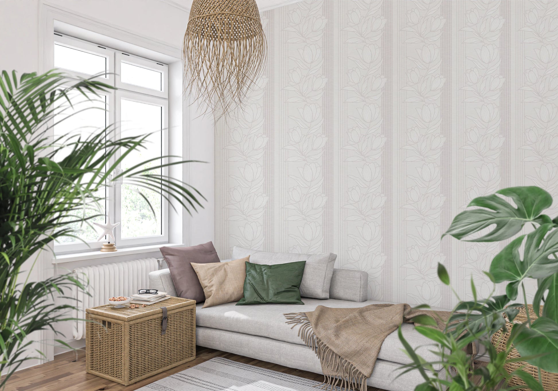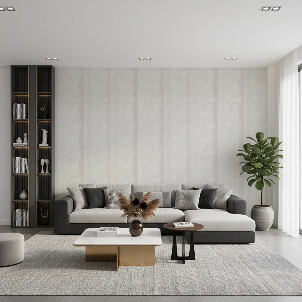 Elevate the charm of your rooms with this sophisticated floral design. Neutral tones create a serene backdrop, and vertical stripes add height to your walls. The stylised flower outlines provide a touch of natural elegance, enhancing spaces from the bedroom to the dining area. Perfect for creating a calming and inviting atmosphere, this wallpaper for walls complements both modern and classic interior styles. Infuse your home with understated luxury as the subtle pattern brings depth and character to every corner, ensuring a visually appealing and seamless finish.