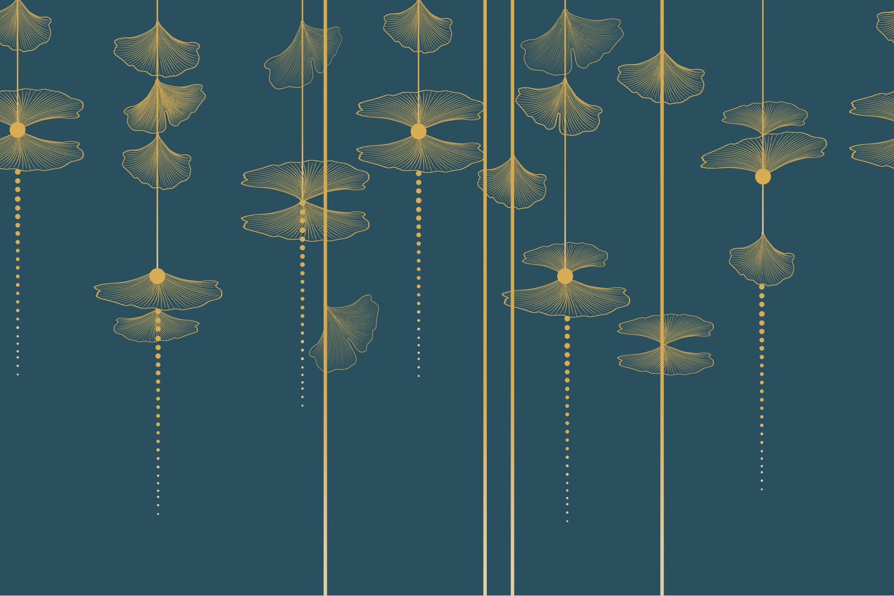 Explore a world of linear grace with this ginkgo leaf design. Strands of gold descend from minimalist, geometric flora against a navy backdrop. Choose this wallpaper for walls to introduce a touch of sophisticated nature. The vertical lines provide height and depth. Picture it in a dining room, study, or entryway, creating a focal point. The combination of gold and navy elevates any space, complementing styles from classic to modern with a balanced palette.