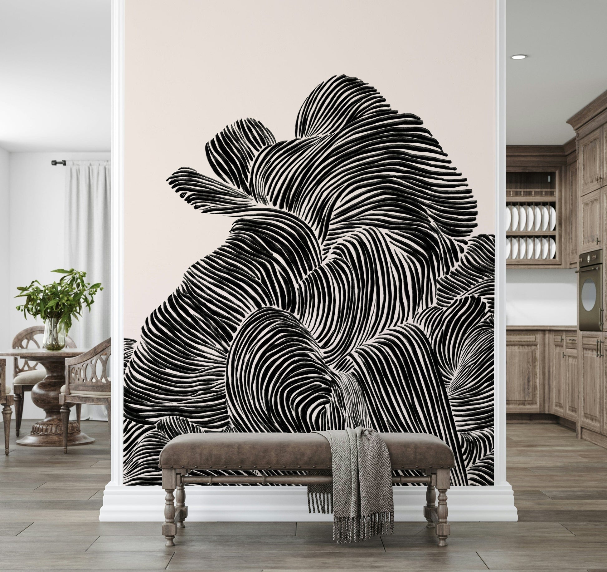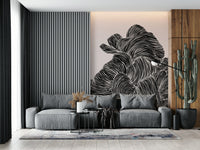 Transform your space with this captivating wallpaper for walls. Featuring bold, black linear patterns undulating across a neutral background, this design creates a striking visual texture. The monochrome palette makes it exceptionally versatile, seamlessly integrating into various décor styles. Use it to create a sophisticated atmosphere in a living room, an intriguing backdrop in a study, or an eye-catching accent in a hallway. The flowing lines add a sense of movement and depth, enhancing smaller rooms whilst complementing expansive spaces. This wallpaper design brings a touch of contemporary artistry to any interior.