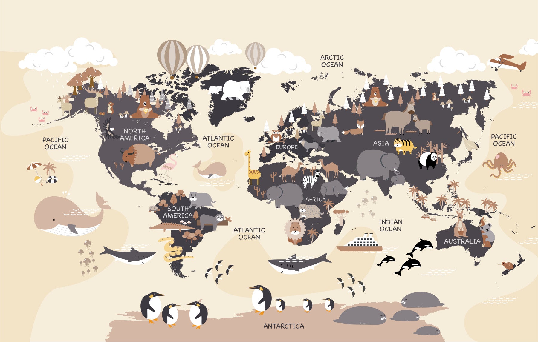 This delightful wallpaper is a whimsical world map designed to inspire young adventurers. The charming illustrations feature animals native to each continent, depicted in soft, muted colors of beige, brown, and grey creating a calming yet stimulating environment. Air balloons and an airplane add a touch of playful fantasy, fostering a sense of wonder and exploration. It's perfect for a child's room, playroom, or any space where learning and imagination are encouraged. Educational and stylish, it's a beautiful blend of form and function.