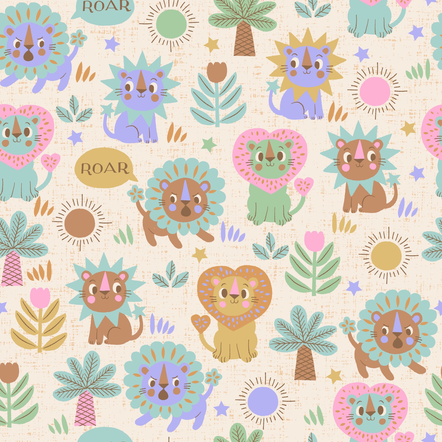 Embrace the playful spirit of the savanna with this adorable "Little Lion" wallpaper. A charming collection of stylized lion cubs in pastel hues frolics amidst a whimsical landscape of stylized suns, palm trees, and blossoming flowers. The textured background adds a touch of rustic charm, enhancing the overall cute and cheerful aesthetic. Each little lion boasts unique mane designs, adding a delightful element of variety to this enchanting scene, perfect for adding a touch of whimsical joy to any space. The playful ‘Roar’ speech bubble completes this joyful and vibrant design.