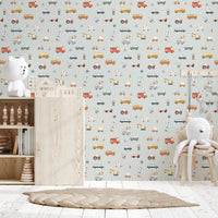 Transform your walls with a touch of whimsy and adventure using this adorable pattern. This wallpaper for walls features an array of cute, cartoon-style vehicles, including fire engines, school buses, and hot air balloons. A soft, neutral palette of light greys, yellows, and reds creates a calming backdrop, perfect for a nursery, kids' playroom, or even a cheerful hallway. The repeat pattern adds subtle detail without overwhelming the space. Enjoy how the design brings a sense of playfulness into your home, making it the perfect focal point for a fun and vibrant room.
