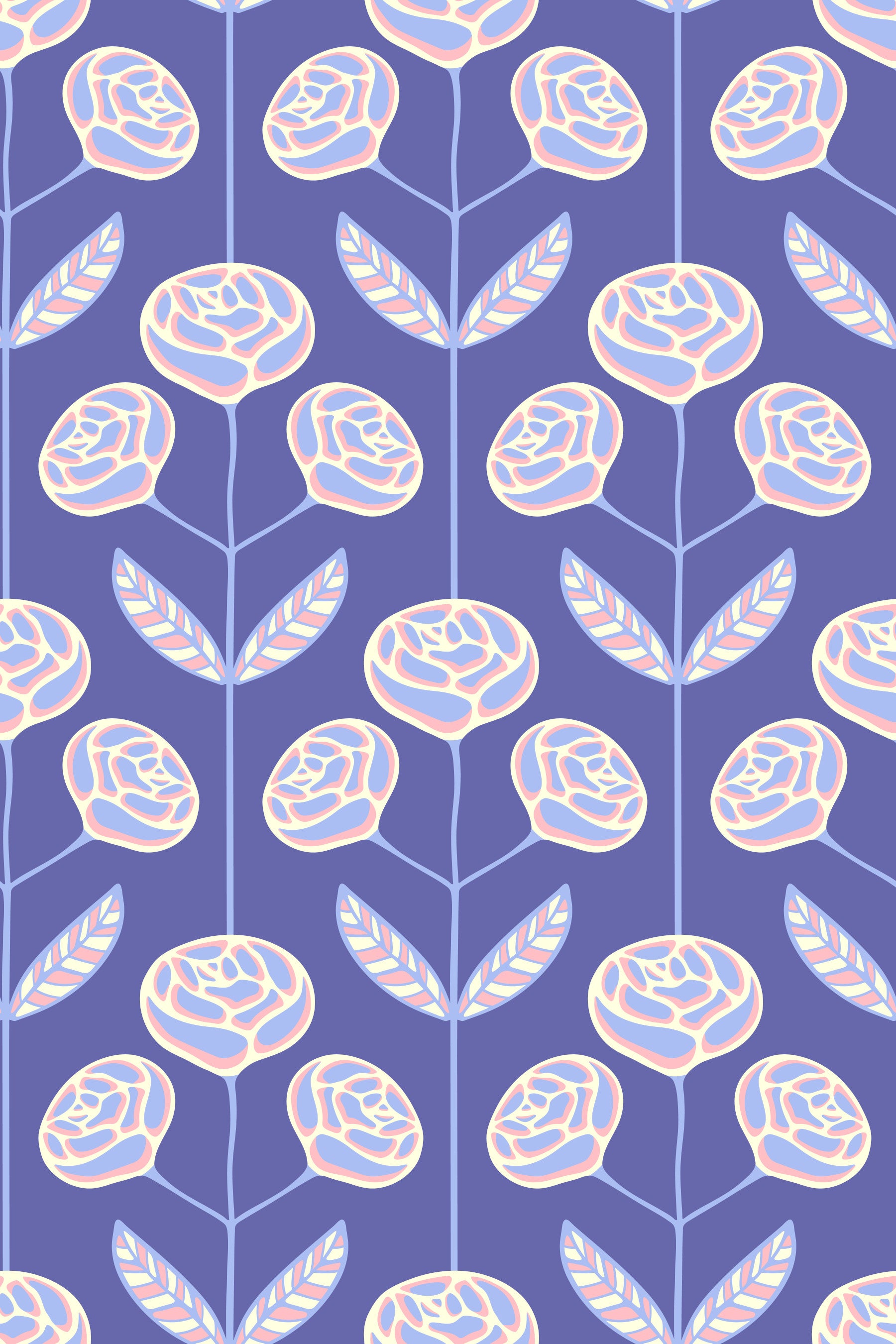 Step back in time with this 'Lola' rose floral, a retro-inspired wallpaper that blends Scandi simplicity and Mid-Century Modern charm. This delightful design features stylized rose flower motifs in a fresh palette of lavender, pink and cream set against a Very Peri Purple background. The clean lines and symmetry evoke a classic mid-century aesthetic, while the charming flowers add a touch of cottage-inspired whimsy. Whether you're looking to add a pop of color to a minimalist space or enhance a vintage-themed cottage decor, this wallpaper offers a versatile and pretty solution. This pattern design is also available in Other Colourways too! Original wallpaper pattern design by Jackie Tahara of UnBlink Studio.