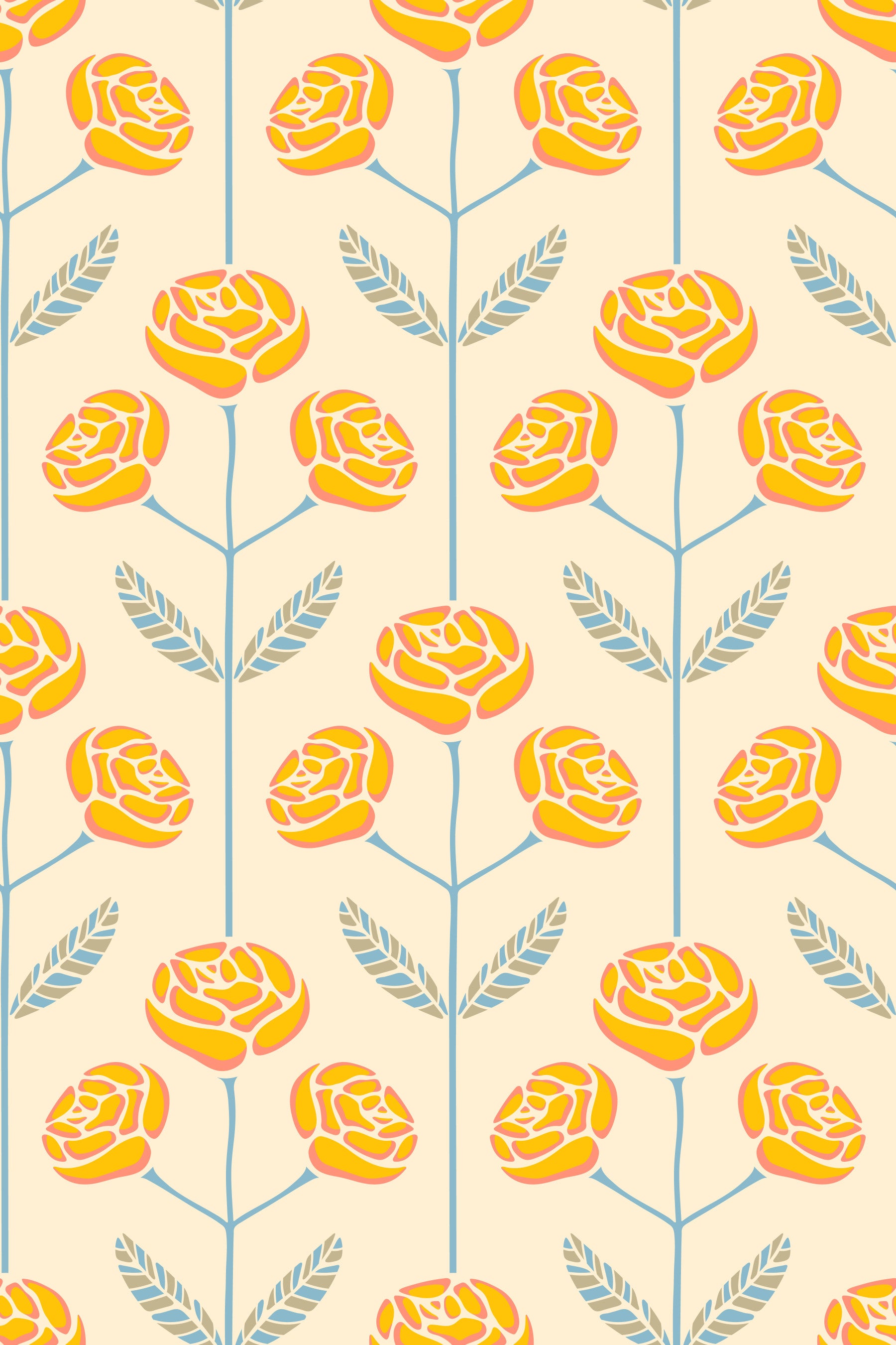 Step back in time with this Lola rose floral, a retro-inspired wallpaper that blends Scandi simplicity and Mid-Century Modern charm. This delightful design features stylized rose flower motifs in a warm and inviting palette of yellow and orange, with blue and gray leaves, set against a soft butter yellow backdrop. The clean lines and symmetry evoke a classic mid-century aesthetic, while the charming flowers add a touch of cottage-inspired whimsy. Whether you're looking to add a pop of color to a minimalist space or enhance a vintage-themed cottage decor, this wallpaper offers a versatile and pretty solution. This pattern design is also available with Sage Green leaves and in Other Colourways too! Original wallpaper pattern design by Jackie Tahara of UnBlink Studio.