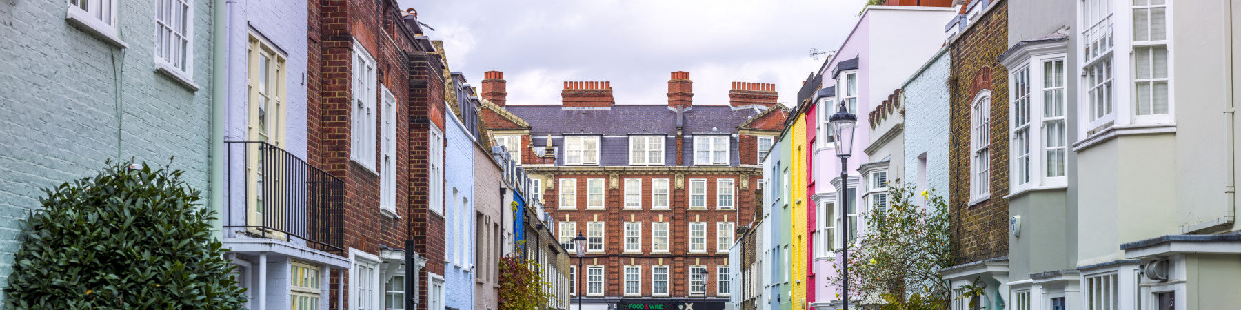 Colorful buildings in Chelsea, London. This design features a series of townhouses. Presenting a vibrant array of colors, which give off British charm. This wallpaper for walls makes a statement piece. Perfect for a modern home office, adding character to a living space, or creating a quirky touch in a hallway. Bring the city to your home with this design. The urban landscape creates an eye-catching focal point, blending style and personality to your home.