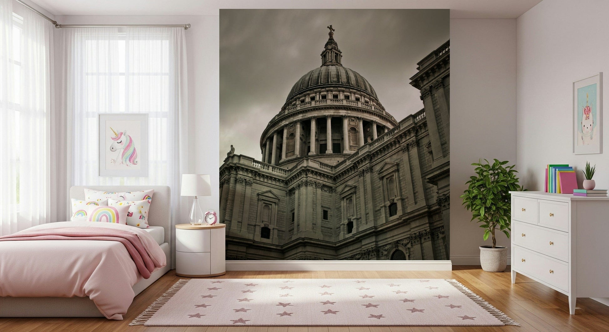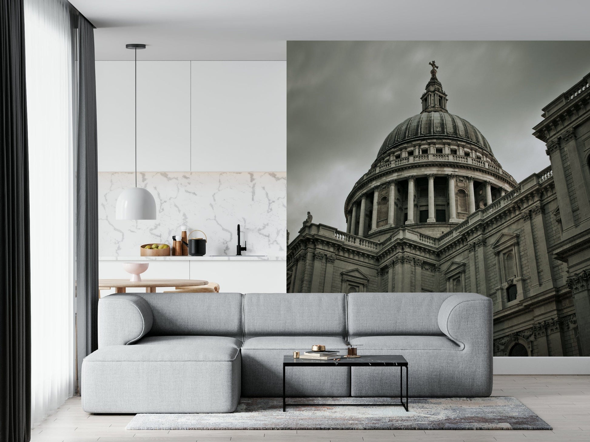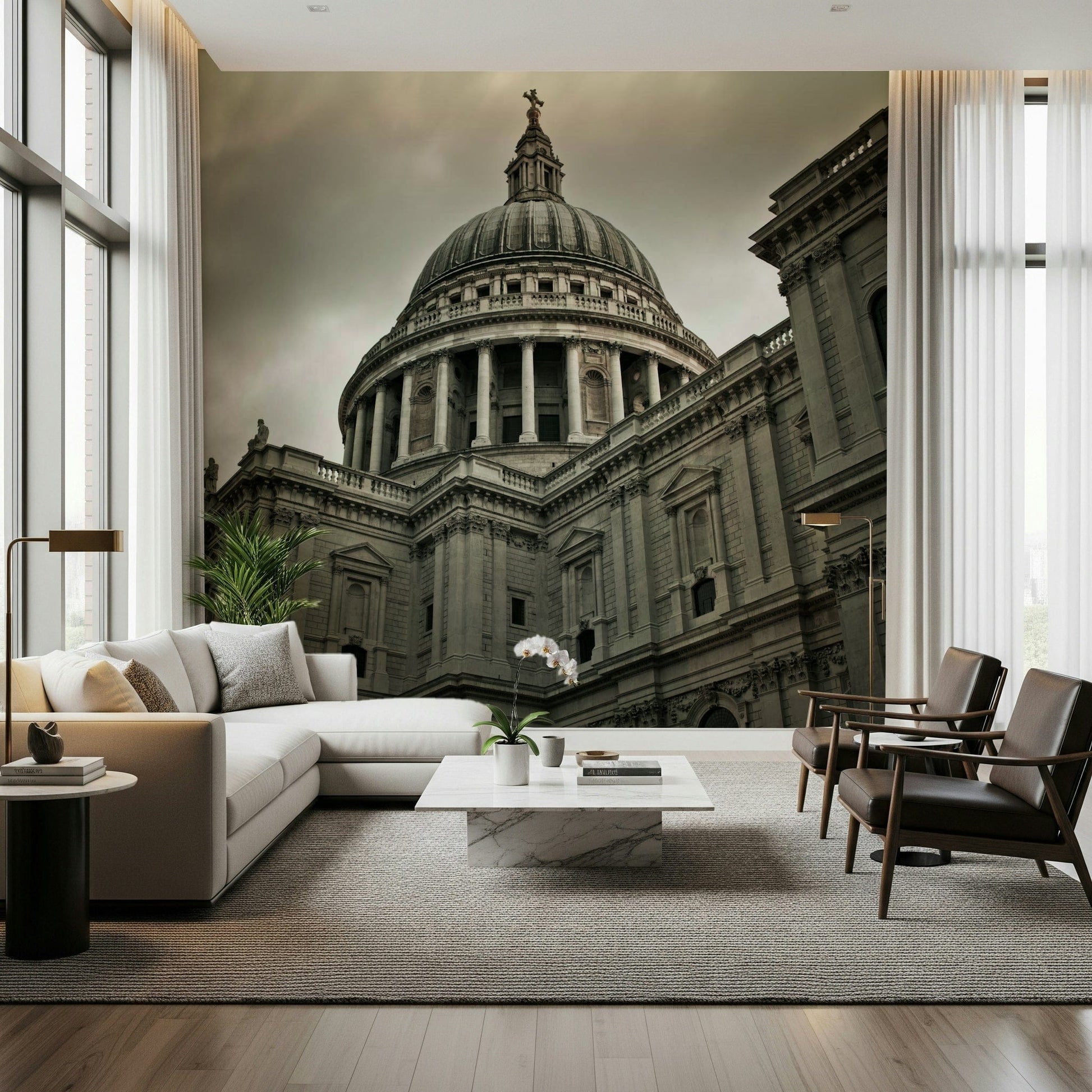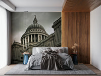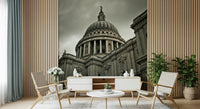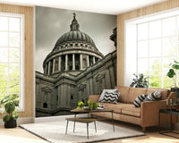 Elevate your interior with this magnificent architectural wallpaper for walls. The design captures a powerful view of a grand cathedral, offering a dramatic focal point for any room. Its imposing dome, framed by detailed columns and intricate stonework, brings a sense of historical gravitas and refined elegance. The muted, grayscale palette exudes sophistication, making it an ideal choice for a study, living room, or hallway seeking a touch of timeless style. Add depth and character, and allow this impressive image to command attention whilst harmonising with existing decor.