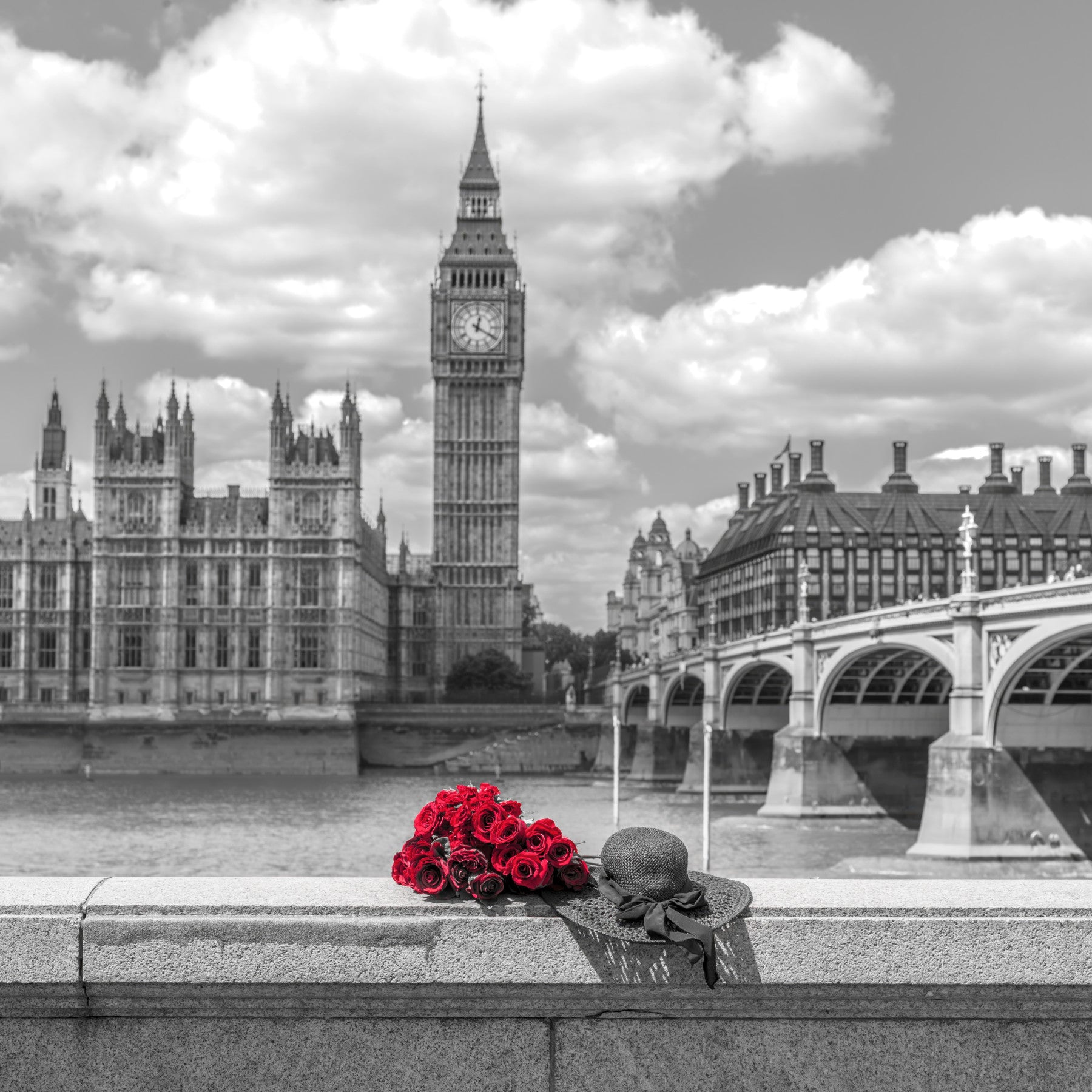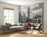 Capture the spirit of London with this striking wallpaper for walls. The design focuses on the iconic Big Ben and Houses of Parliament in a classic monochrome palette. A burst of vivid red roses and a charming hat add a touch of romance. This design brings a sophisticated and timeless feel to your living room, bedroom, or hallway. It offers a unique blend of classic architecture and modern flair, transforming your space into a stylish tribute to one of the world's most beloved cities.