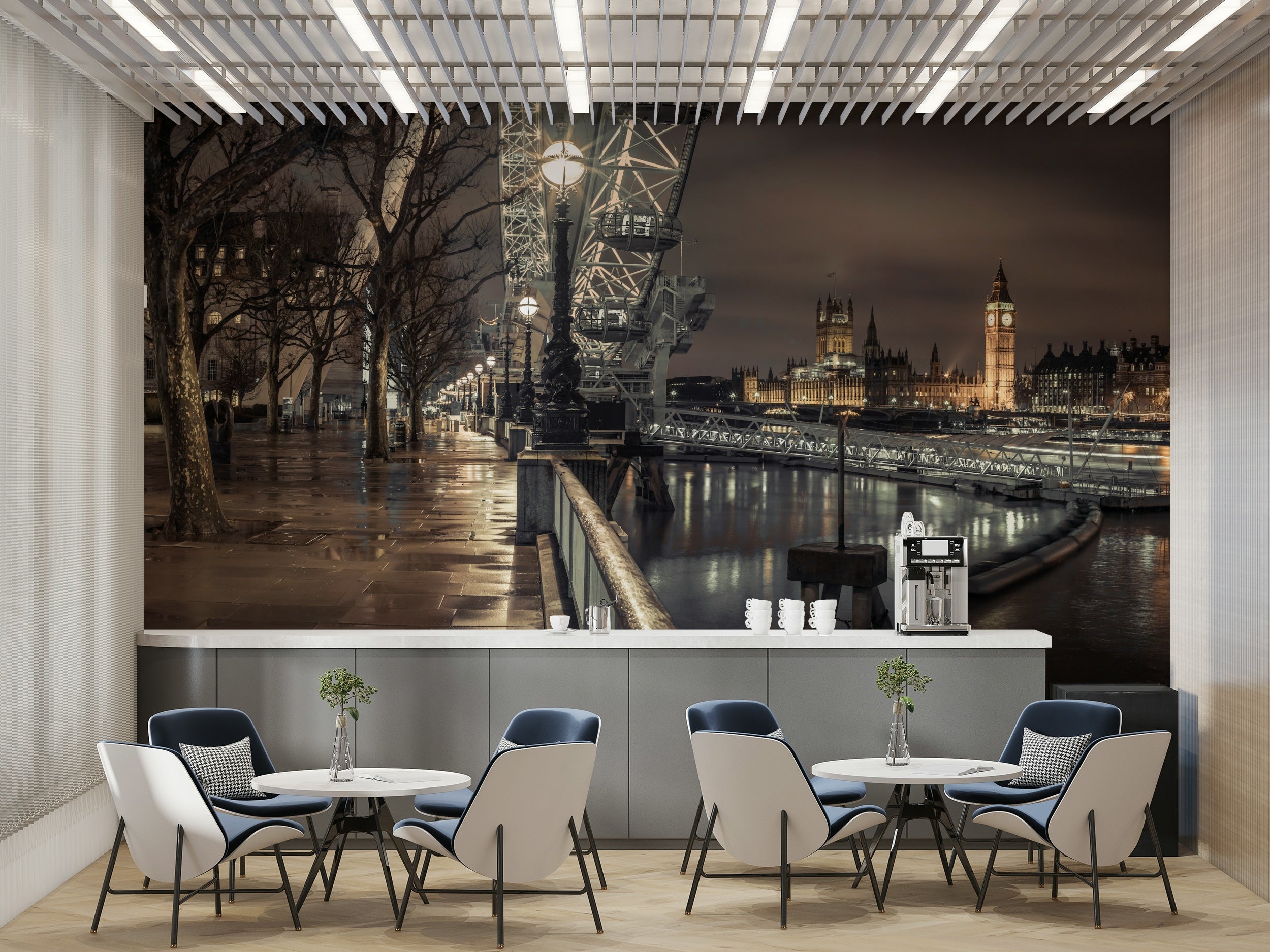 London cityscape in evening. Embrace the captivating allure of London at night with this breathtaking wallpaper. The image captures the iconic London Eye, its illuminated structure standing tall against the backdrop of the Houses of Parliament and the majestic Big Ben. The calm waters of the Thames River reflect the city's glittering lights, creating a mesmerizing mirror image. Bare winter trees line a wet cobblestone path, adding a touch of quiet solitude to the vibrant urban scene. This wallpaper evokes a serene yet energetic mood, perfect for adding a touch of sophisticated London charm to your digital devices.